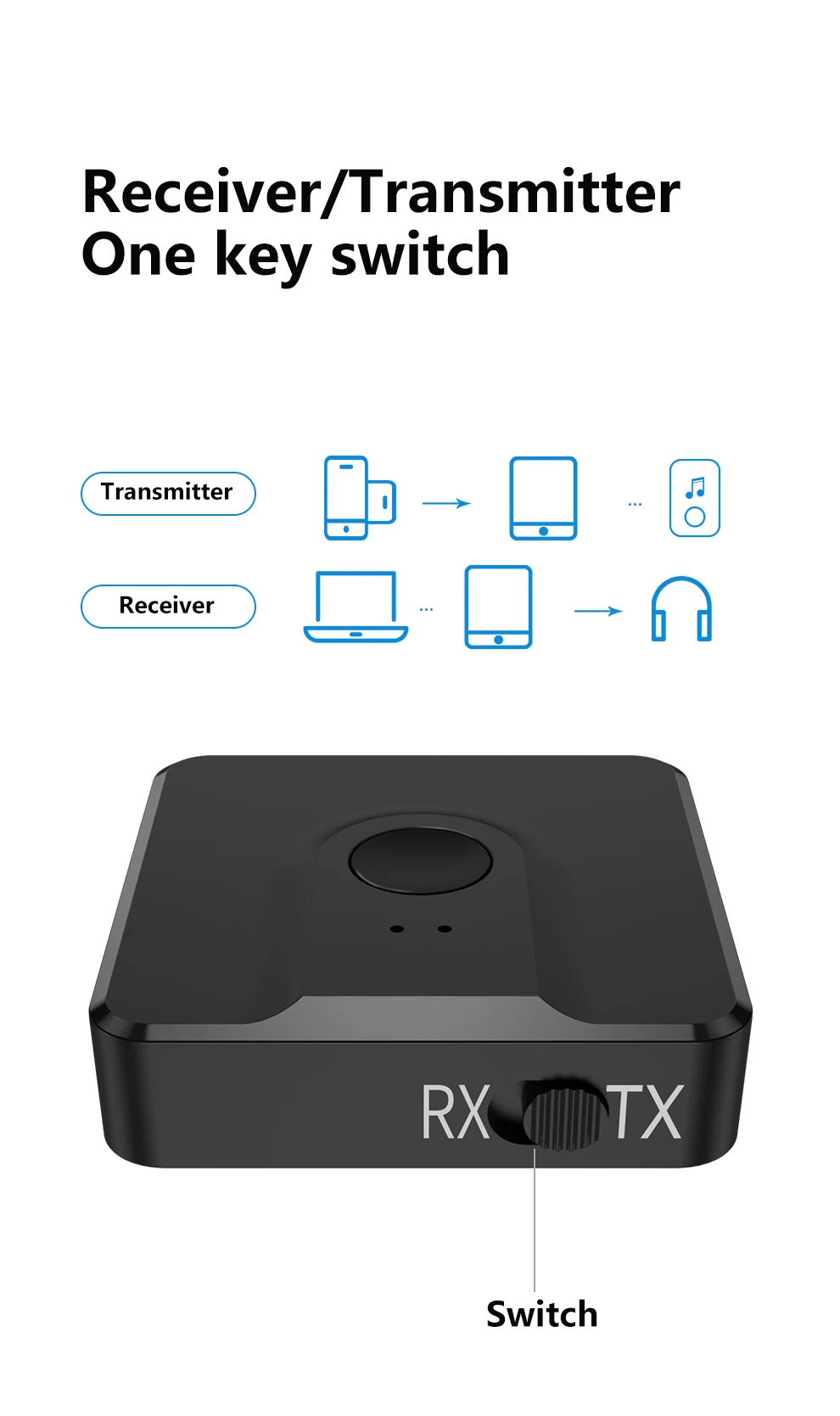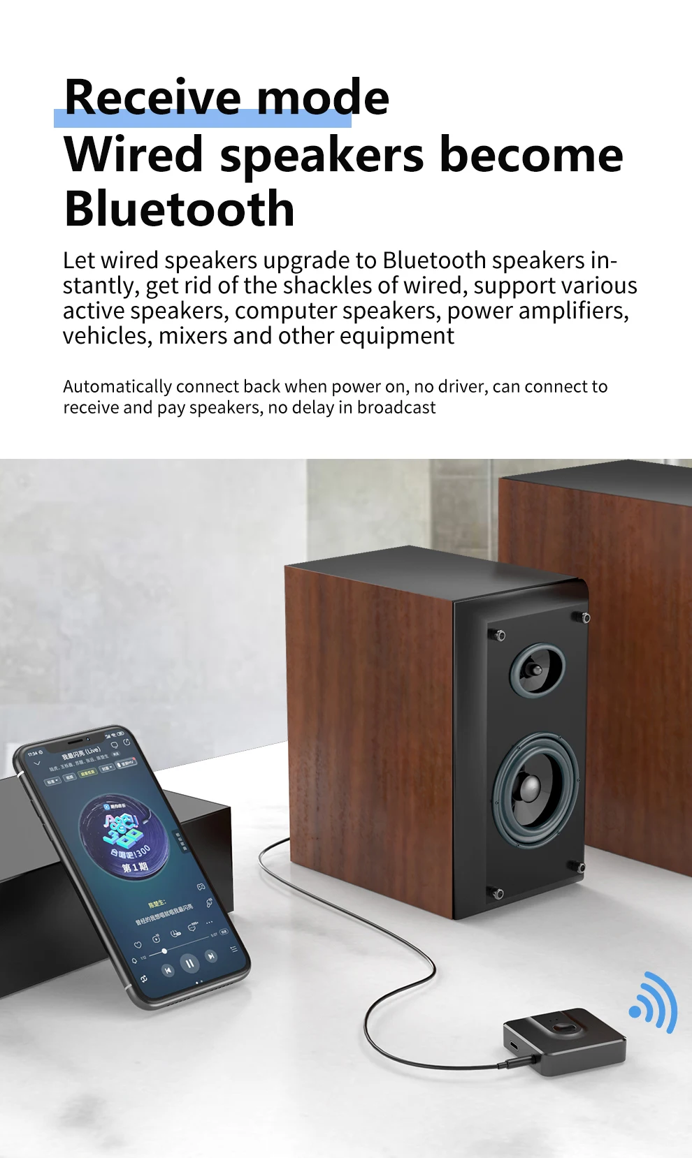 Режим подключения AUX, поддержка подключения нескольких устройств, поддержка интерфейса AUX может быть подключена к компьютерам, телевизорам, мобильным телефонам, аудио и другому оборудованию для достижения беспроводной передачи.