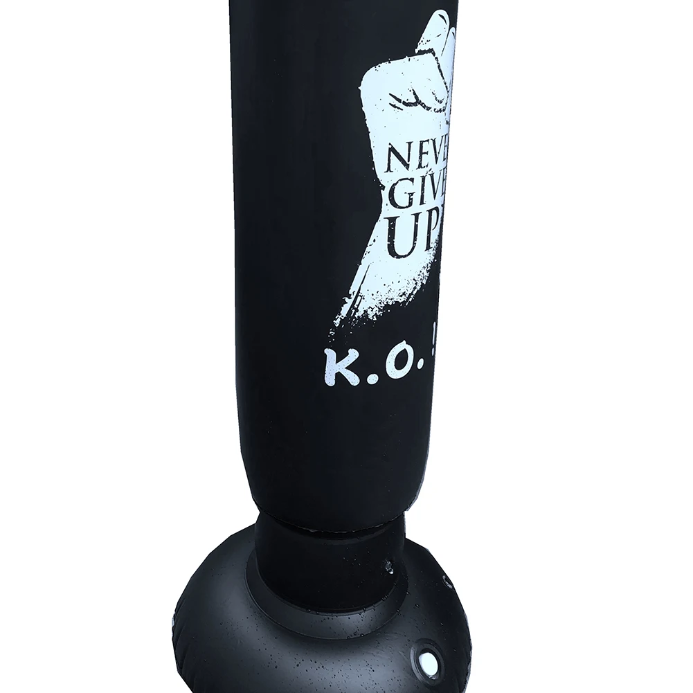 Feature: The inflatable boxing column has a strong and durable base, and the sandbag can bounce to its original position after each impact. After hitting the ball, it will continue to bounce immediately. This sandbag brings unlimited energy to children who are exercising. The boxing bag has been strictly tested, but it still maintains a smooth and seamless surface to avoid skin damage. The double-layer structure can prevent water and air leakage, allowing you to spend high-quality toys with your children. It is made of soft material, full of air, comfortable hands and feet, and won't hurt anyone. It won't tear. Just fill the bottom with water (no leakage) or sand. If you want to inflate the top with a mouth or pump, you can start using it. When not in use, you can empty it and fold it up, ready to play again. Specification: Color: Black, Red Style: K.O Material: PVC Weight: About 700g Height after inflation: 160cm/63in Package size: 250 * 200 * 70mm/9.8x7.9x2.8in Note: Due to the different monitor and light effect, the actual color of the item might be slightly different from the color showed on the pictures. Thank you! Please allow 1-2cm measuring deviation due to manual measurement. ![]() 1 x Boxing Bag Stand