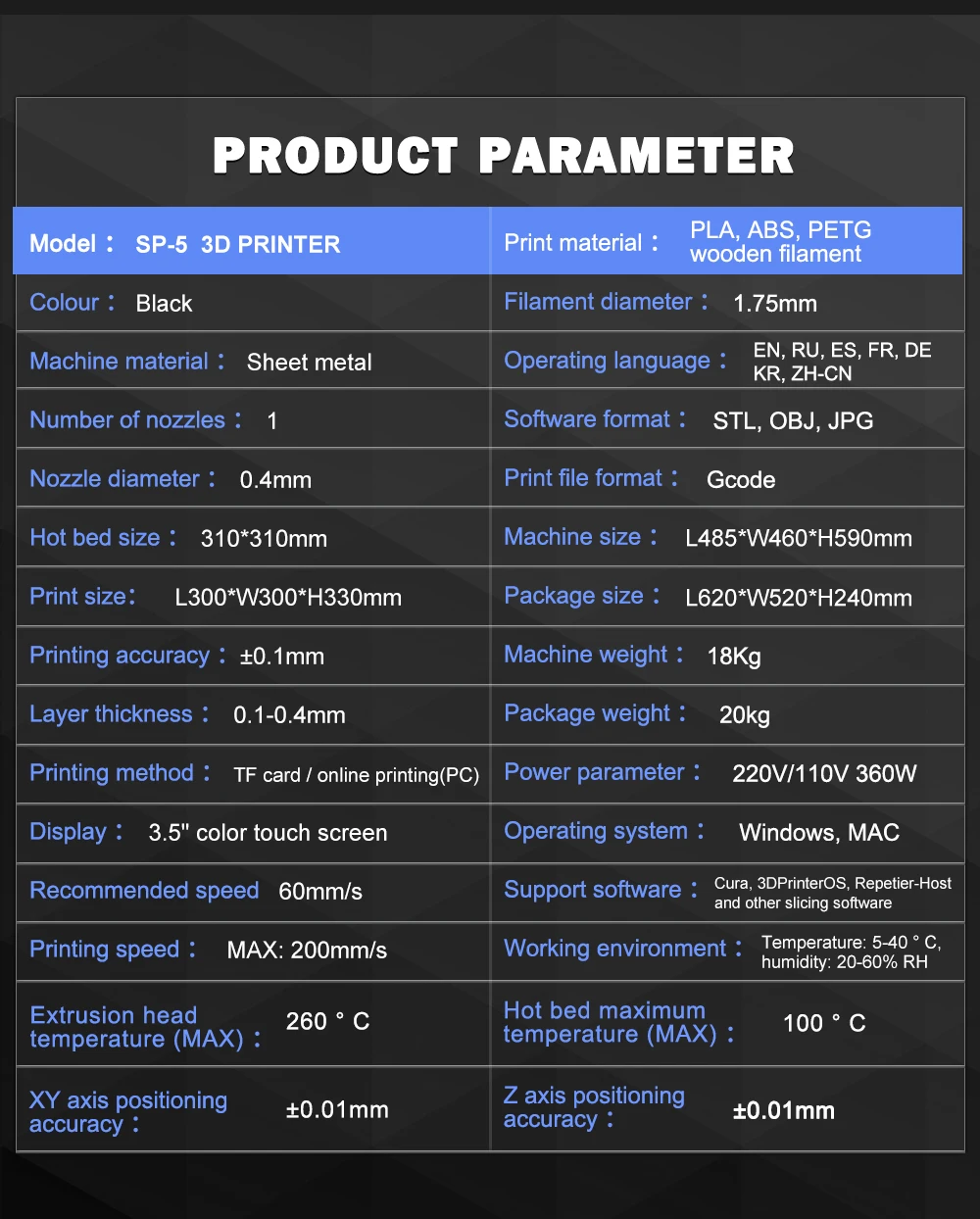 Поддержка программного обеспечения: Cura,3D принтер OS,Repetier-Host и другие нарезки программного обеспечения