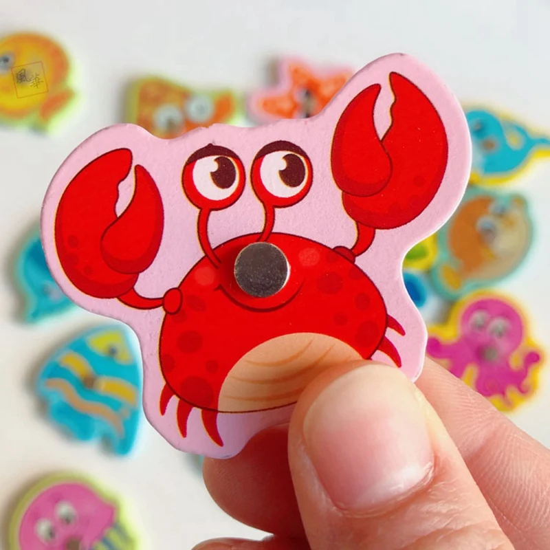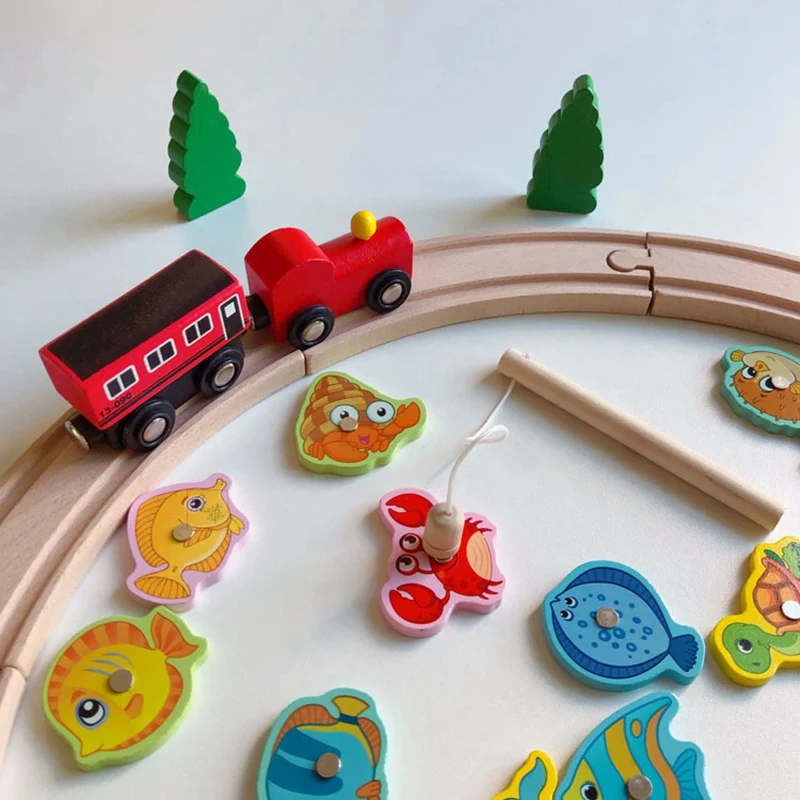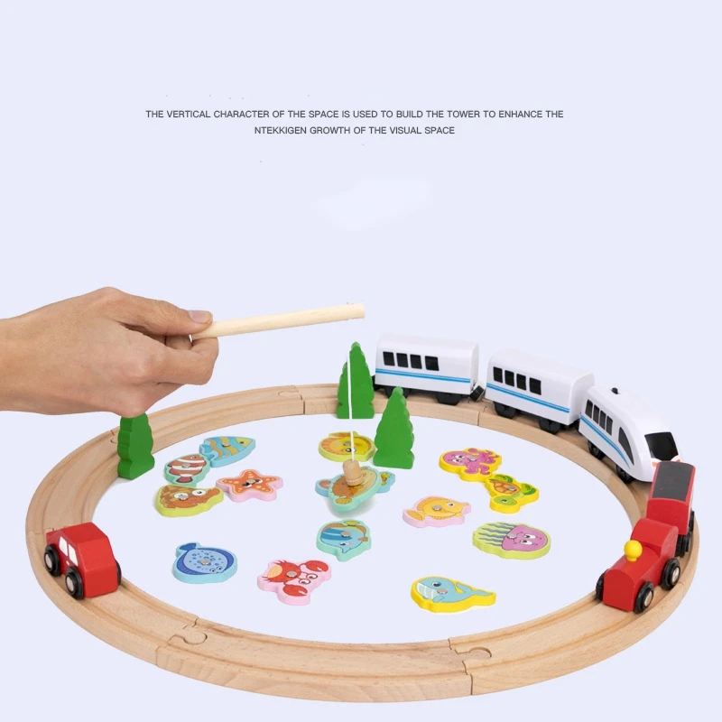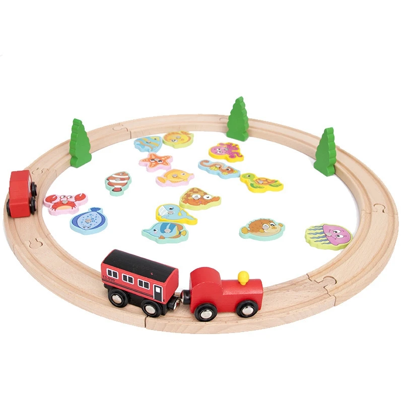 Children's Wooden Electric Small Train Track Set Magnetic Puzzle Building Block Assembly Fishing Game Toy Set Oval track + 3 train cars + fishing game, free splicing.Our toys can let the baby know the rich marine life, and exercise the baby's patience.