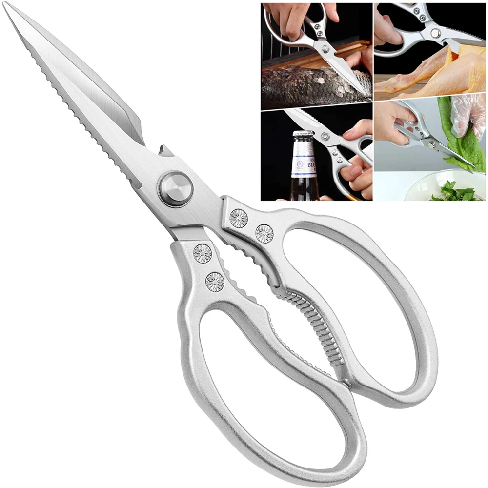 【Многофункциональные кухонные ножницы 】: кухонные ножницы хорошо работают во всех основных кухонных задачах, таких как резка курицы/птицы, мяса, овощей, свежих фруктов, трав, шоколада и даже струн, упаковка и стебли цветов. Встроенный открывалка для бутылок удобен. Попробуйте нарезать начинку для салата, Разрежьте пиццу, удалите пятна от продукта. Вы можете использовать его для наружных задач, таких как обрезка кустов роз, обрезка ветвей, резка картона, бумаги и жесткого пластика.