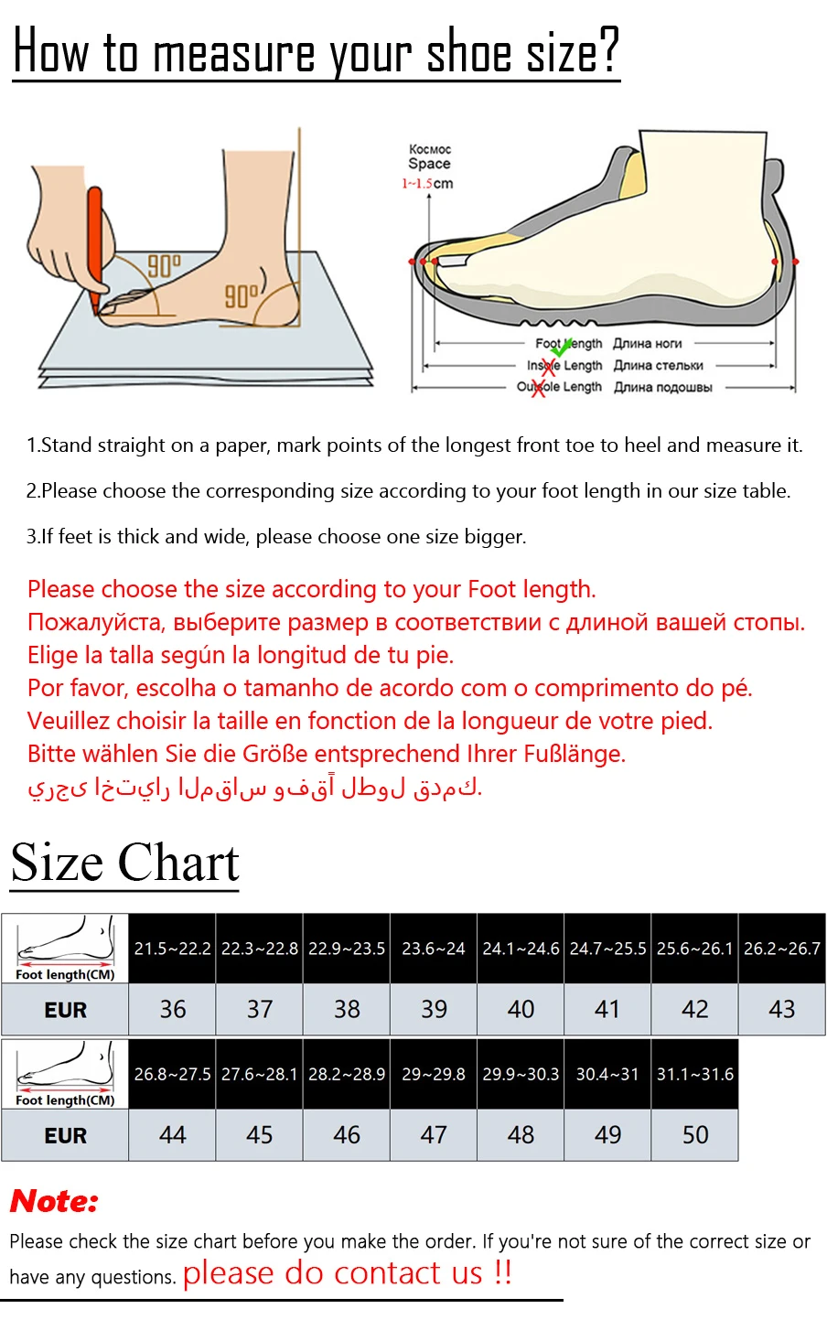 Прежде чем сделать заказ, вы должны быть осторожны, чтобы измерить длину вашей стопы (От пятки до носка). Затем, пожалуйста, выберите соответствующий размер в соответствии с длиной Вашей стопы в нашей таблице размеров. Если у вас есть какие-либо вопросы, пожалуйста, свяжитесь с нами.