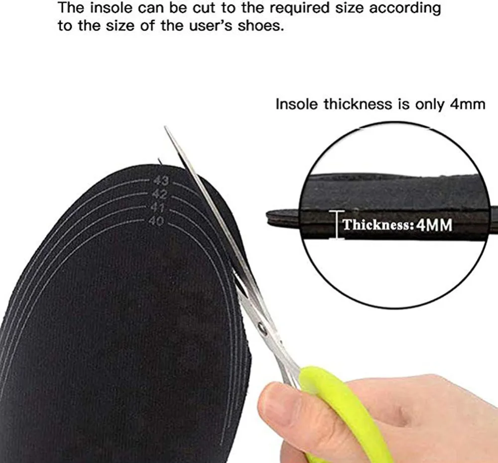 【Разрезаемый Размер 】нагревательная подошва может быть обрезана и формы, толщина 5 мм, и подходит для мужчин и женщин от 41 до 46 размеров. Линия размеров обуви (35-45 размеров) напечатана на стельке; Верхняя часть 46 размеров, может быть вырезана в соответствии с номером линейки размеров. Однако диапазон нагрева находится в пределах 35 размеров от линии размеров обуви, поэтому его нельзя разрезать в пределах 35 размеров.