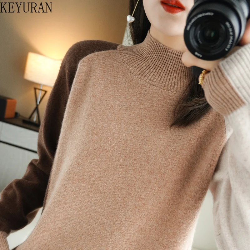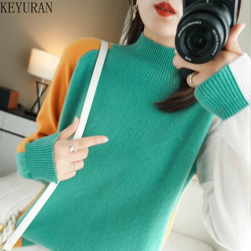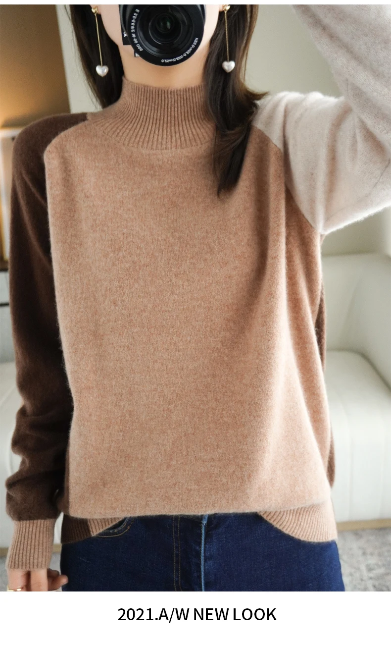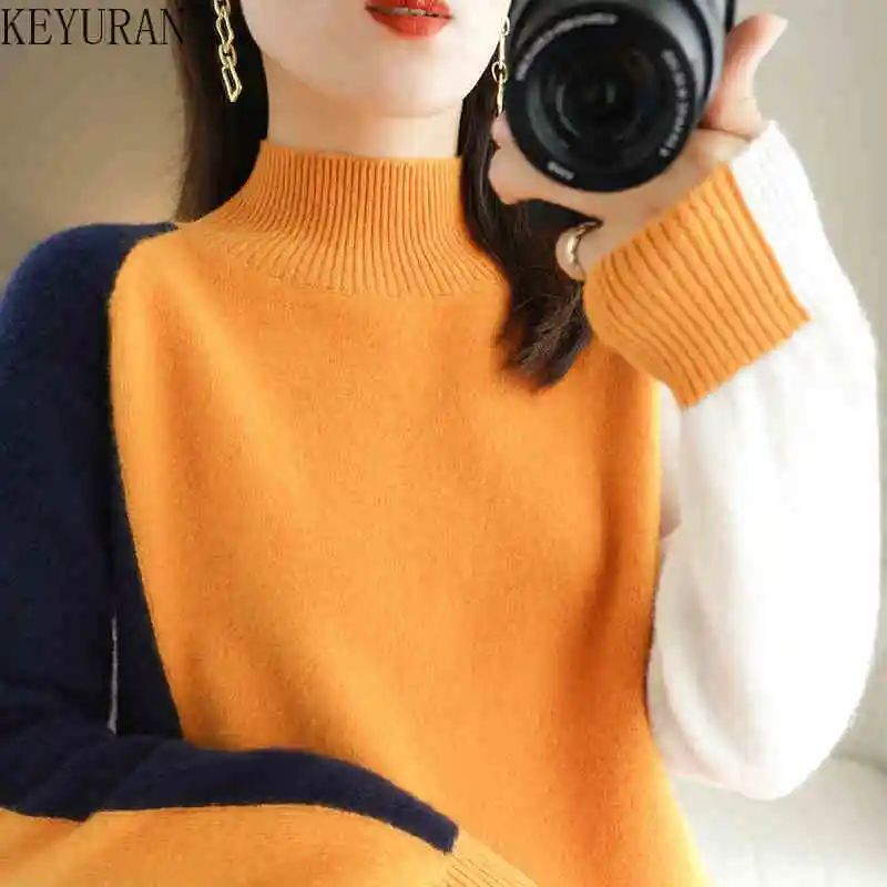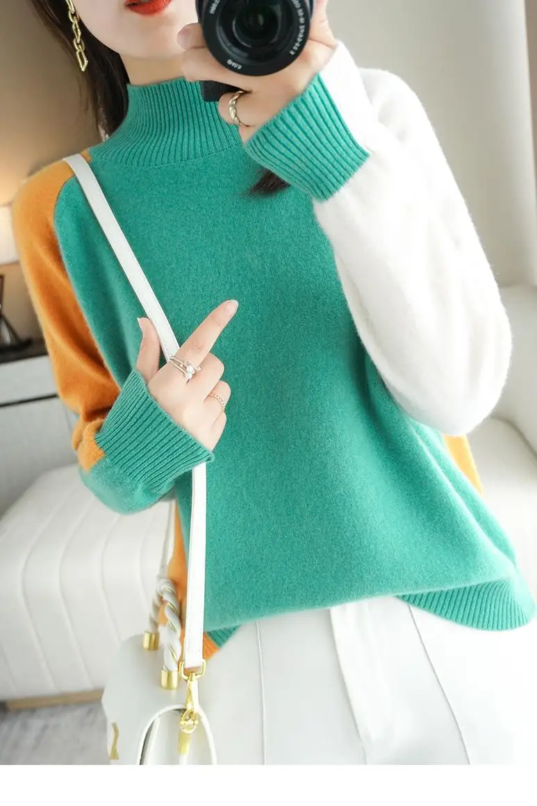 Отзывы о Женский вязаный свитер-водолазка Свободный пуловер контрастных цветов в стиле