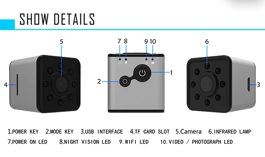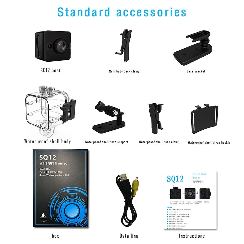 Характеристики SQ11Датчик: 2 мега CMOS датчик GC1024Диафрагма: F 2,0Фокусное Длина: f = 2,9 ммОптический FOV(D):140Оптический FOV(H):90Память: TF карта, до 32 Гб (не входит в комплект)Микрофон: ВстроенныйБатарея: 3,7 V 200mAhUSB: высокоскоростной USB2.0 MicroРазмер: 23*23*23 ммВес нетто: 20 гИзображениеРазрешение изображения: 12 м (4032*3024)Формат файла: JPEGПропорция изображения: 4:3ВидеоРазрешение видео: 1920*1080P 1280*720PЧастота кадров видео: 30 кадров в секундуВидео (сжатие) Формат: AVI(M-JPEG)Непрерывное время записи видео: запись видео 100 минутПараметрыРабочая температура: -10 ~ 50 градусов ЦельсияТемпература хранения: -10 ~ 70 ЦельсияВлажность окружающей среды: 5%-90% (без конденсации)Сертификация: CCC,CE,FCCПластмассовые аксессуары: естьMontion обнаружение: ПоддержкаВыход ТВ: ПоддержкаСкорость передачи: Высокая скорость USB2.0Тип интерфейса: Mini 8Pin USBПоддержка Sytem:Windows ME/2000/XP/2003/VISTA. MAC OS.LINUXПосылка в том числе1 * хост SQ11 (поставляется с оригинальной коробкой)1 * Универсальный кронштейн1 * зажим1 * USB/TV Out 2 в 1 кабель1 * инструкцииSQ12 FeauresДатчик: 2 мега CMOS датчик GC1024Диафрагма: F 2,5Фокусное расстояние: f = 2,33 ммОптический FOV(D):155Оптический FOV(H):97Оптический FOV(V):72Память: TF карта, до 32 Гб (не входит в комплект)Микрофон: ВстроенныйБатарея: 3,7 V 200mAhUSB: высокоскоростной USB 2,0 8pinРазмеры: 24,5*24,5*25,5 ммВес нетто: 11 гИзображениеРазрешение изображения: 12 м (4032*3024)Формат файла: JPEGПропорция изображения: 16:9ВидеоРазрешение видео: 1920*1080PЧастота кадров видео: 30 кадров в секундуВидео (сжатие) Формат: AVI(M-JPEG)Непрерывное время записи видео: запись видео 80 минутПараметрыРабочая температура: -10 ~ 50 градусов ЦельсияТемпература хранения: -10 ~ 70 ЦельсияВлажность окружающей среды: 5%-90% (без конденсации)Сертификация: CCC,CE,FCCПластмассовые аксессуары: естьMontion обнаружение: ПоддержкаВыход ТВ: ПоддержкаСкорость передачи: Высокая скорость USB2.0Тип интерфейса: Mini 8Pin USBПоддержка Sytem:Windows ME/2000/XP/2003/VISTA. MAC OS.LINUXПосылка в том числе1 * хост SQ12 (поставляется с оригинальной коробкой)1 * Основной зажим для задней панели1 * Базовый кронштейн1 * водонепроницаемый корпус1 * Водонепроницаемая основа для корпуса1 * Водонепроницаемый защитный зажим1 * Водонепроницаемая пряжка для ремня1 * линия передачи данных1 * инструкцииХарактеристики SQ13Датчик: 2 мега CMOS датчик GC1024Диафрагма: F 2,5Фокусное расстояние: f = 2,33 ммОптический FOV(D):155Оптический FOV(H):97Оптический FOV(V):72Память: TF карта, до 32 Гб (не входит в комплект)Микрофон: ВстроенныйБатарея: 3,7 V 300mAhUSB:MicroUSB2.0 5PINРазмер: 29,9*28*28 ммВес нетто: 24,1 гИзображениеРазрешение изображения: 12 м (4032*3024)Формат файла: JPEGПропорция изображения: 16:9ВидеоРазрешение видео: 1920*1080PЧастота кадров видео: 30 кадров в секундуВидео (сжатие) Формат: AVI(M-JPEG)Непрерывное время записи видео: запись видео 90 минутПараметрыРабочая температура: -10 ~ 50 градусов ЦельсияТемпература хранения: -10 ~ 70 ЦельсияВлажность окружающей среды: 5%-90% (без конденсации)Сертификация: CCC,CE,FCCПластмассовые аксессуары: естьMontion Detection: не поддерживаетВыход ТВ: ПоддержкаСкорость передачи: Высокая скорость USB2.0Тип интерфейса: Micro USBПоддержка Sytem:Windows ME/2000/XP/2003/VISTA. MAC OS.LINUXПосылка в том числе1 * хост SQ13 (поставляется с оригинальной коробкой)1 * Универсальный кронштейн1 * водонепроницаемый корпус1 * Водонепроницаемая основа для корпуса1 * линия передачи данных1 * инструкцииХарактеристики SQ23Датчик: 2 мега CMOS датчик GC1024Диафрагма: F 2,5Фокусное расстояние: f = 2,33 ммОптический FOV(D):155Оптический FOV(H):97Оптический FOV(V):72Память: TF карта, до 3