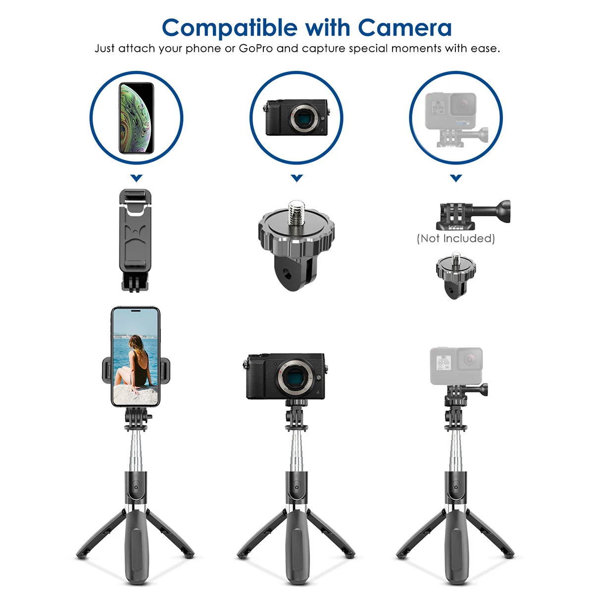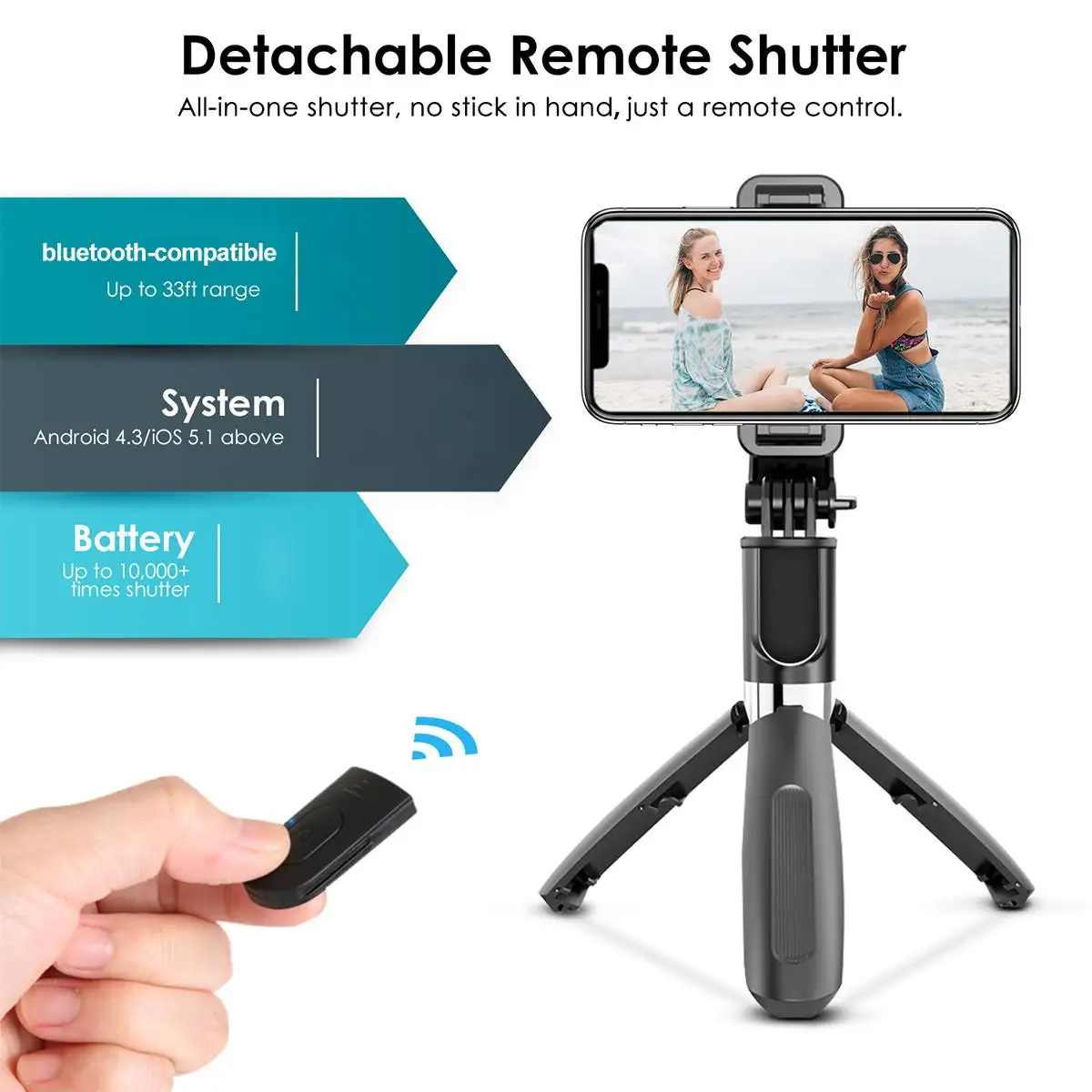 Особенности: ● [4 в 1 дизайн]: 4 в 1 штатив-Палка для селфи с беспроводным пультом, он прост в использовании, когда вы делаете собственные или групповые фотографии, а также позволяет отделить пульт дистанционного управления, сдвиньте его и управляйте беспроводным затвором, чтобы делать фотографии или записывать видео. Благодаря режиму антивибрационного штатива вы сможете записывать каждый счастливый и значимый момент в вашей жизни. ● [Регулируемый угол и стабильность]: с вращением на 360 градусов слотов для карт и обзором на 203 градусов, вы можете повернуть селфи-палку и выбрать идеальный угол, когда вы делаете фотографии. Селфи-палка не скользит и очень стабильна, поэтому вам не нужно будет беспокоиться, что ваш телефон будет падать, когда вы делаете фотографии. ● [Сильная совместимость]: селфи-палка bluetooth работает с большинством смартфонов iOS 5,1/Android 4,4 или выше, таких как 12ProMaX 12Pro 12 12Mini 11ProMax 11Pro 11 XSMax XS X XR 8 8Plus 7 7Plus, huaWei и другие смартфоны. ● [Мини и портативный]: с сложенным размером 18,6 см, это очень мини и удобно для вас, чтобы забрать, потому что вы можете положить его в карман или сумку. И длина растяжения до 100 см, это поможет вам сделать более широкий угол фотографии с более короткой длиной и получить более широкий пейзаж. ● [Потрясающий Срок службы батареи]: со встроенной литиевой батареей емкостью 65 мАч вы можете непрерывно делать более 30000 фотографий. Время в режиме ожидания селфи-палки очень длинное, что позволяет делать много фотографий, как вам нравится, когда вы идете в путешествие, провести Вечерние и так далее.