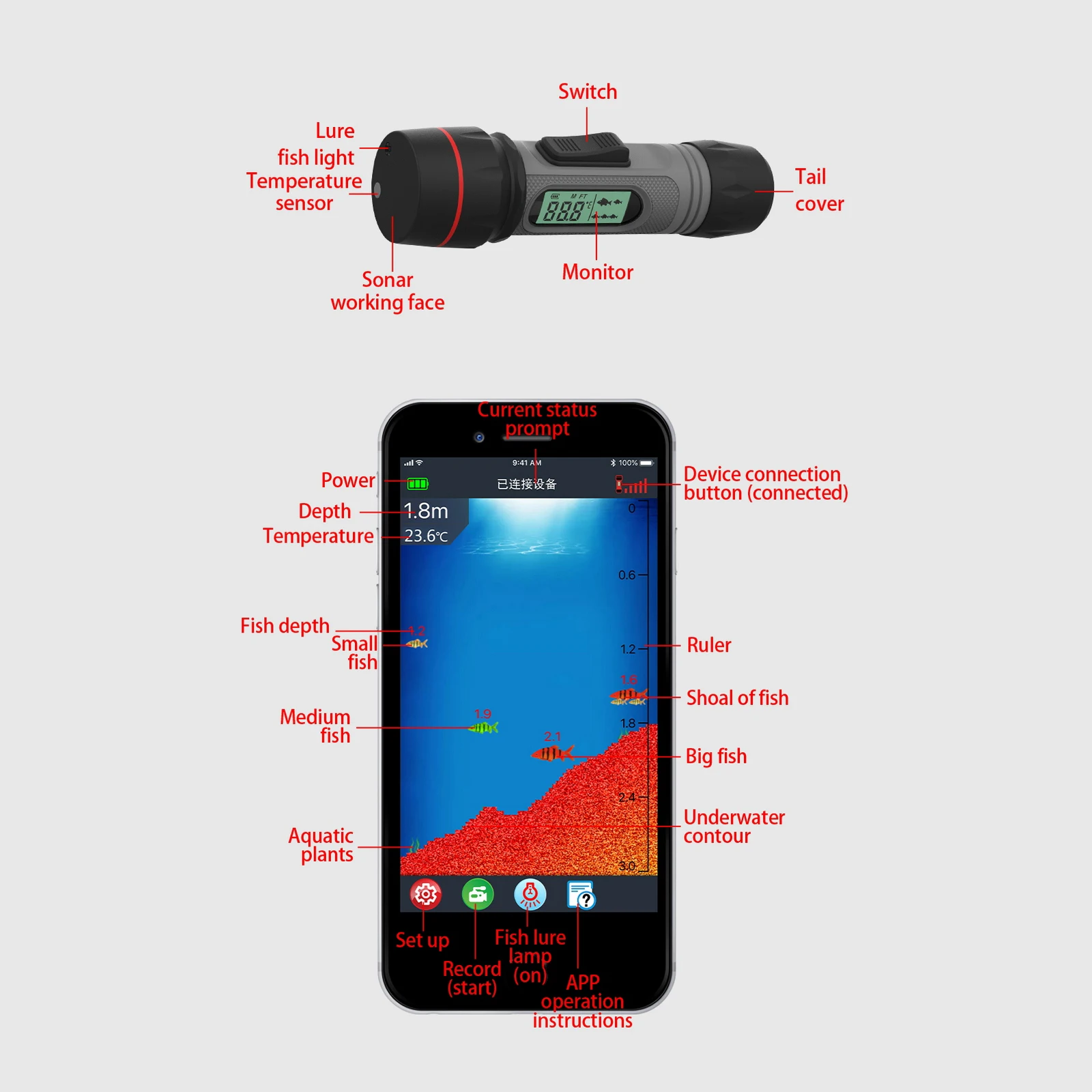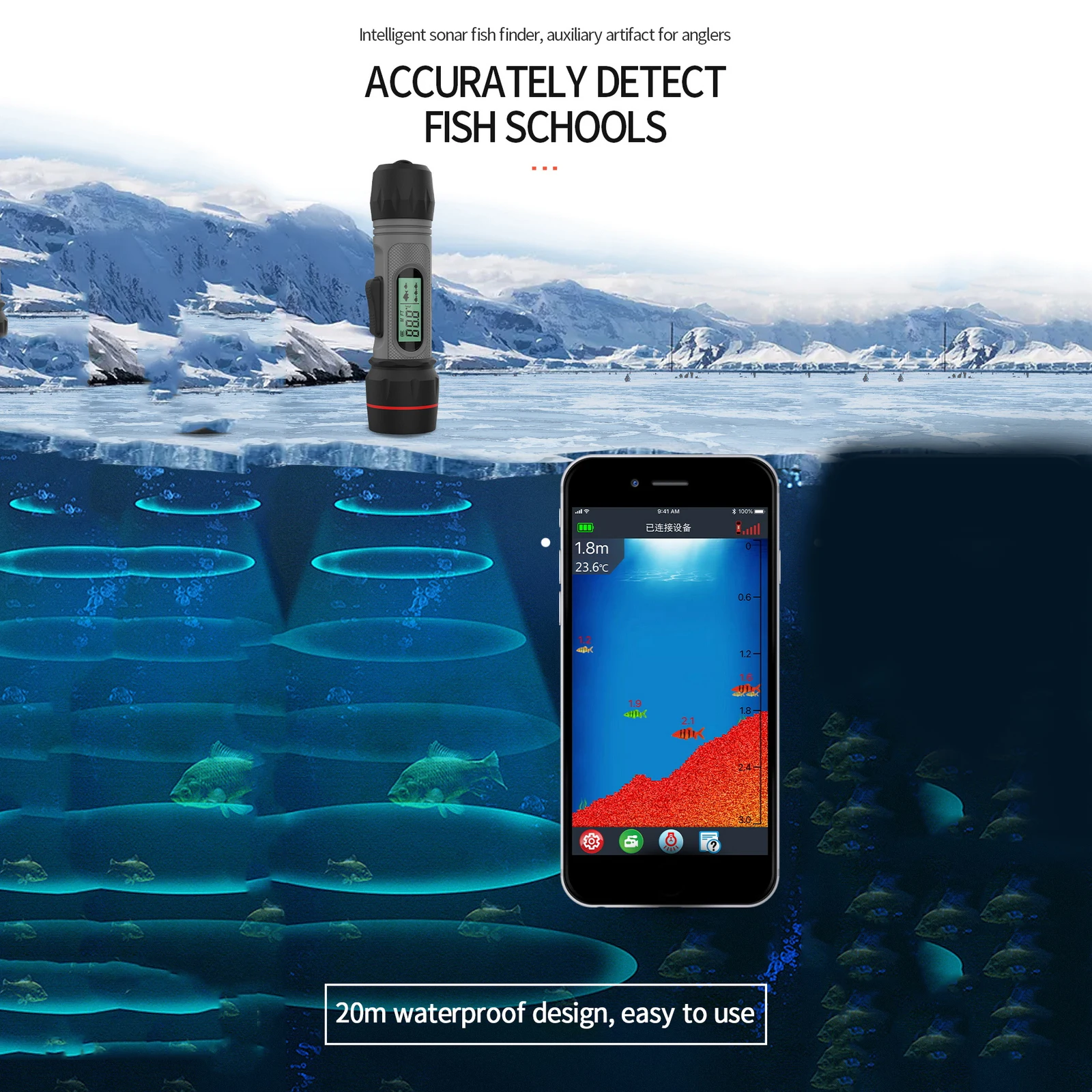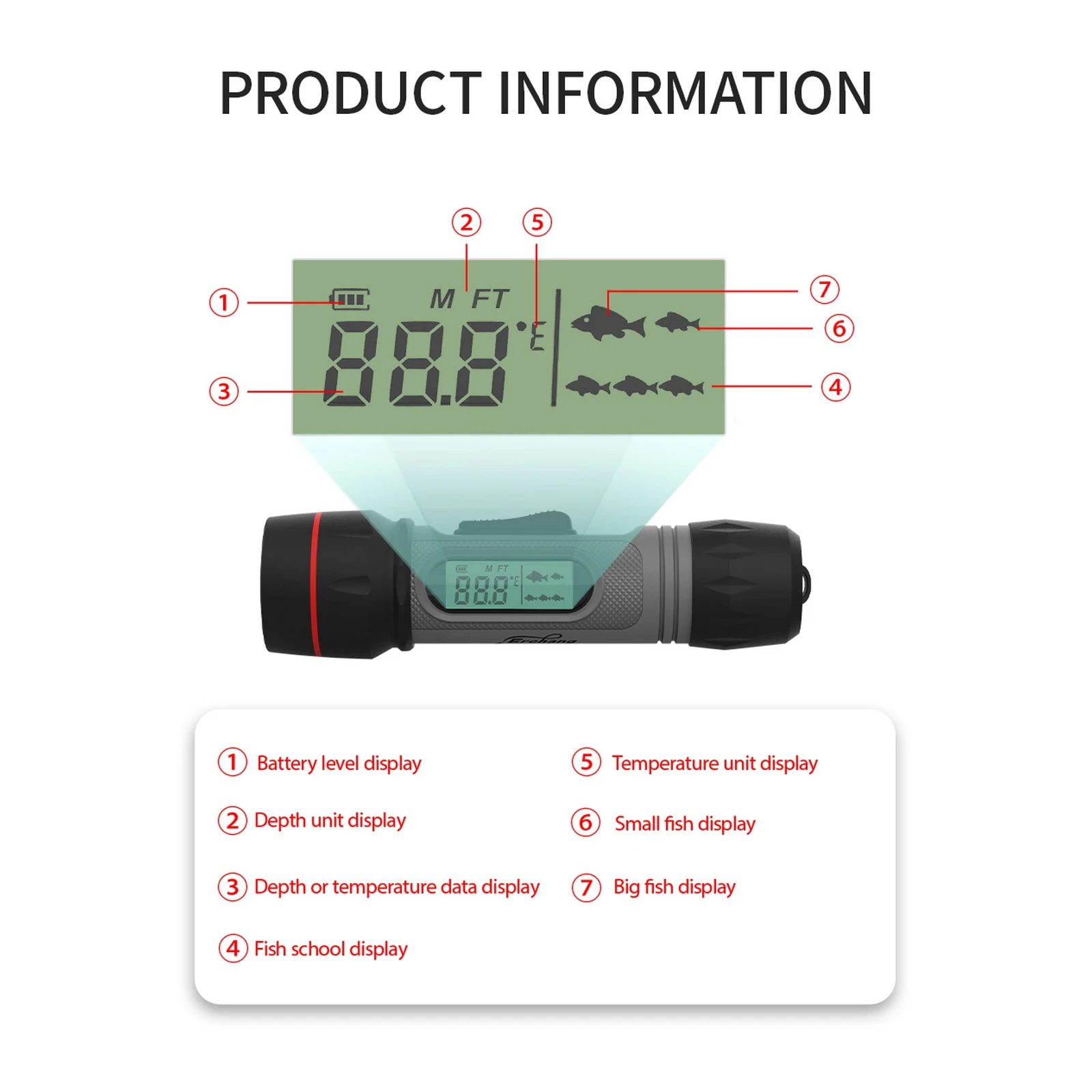 Особенности:1. Испытание гидролокатора: нанесите оборудование на лед для тестирования.