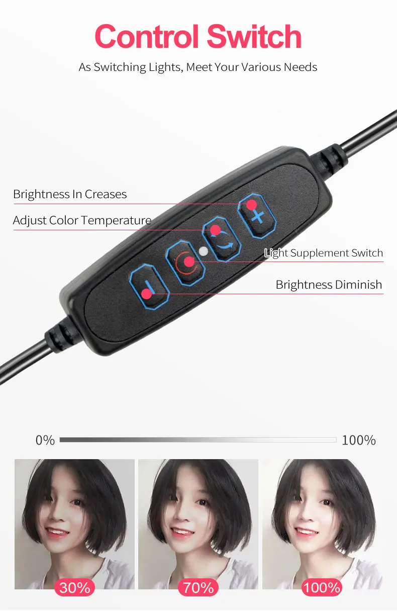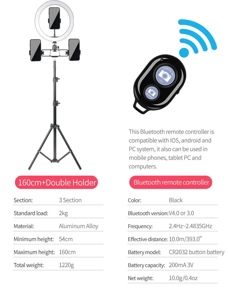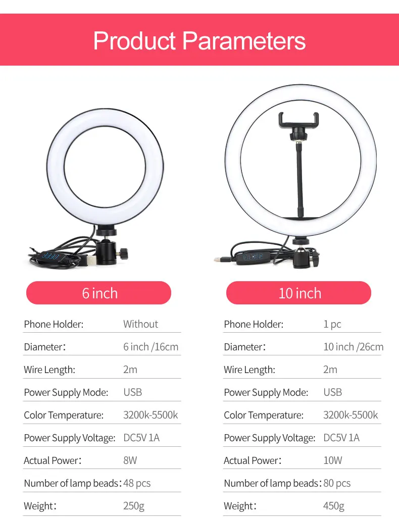 Описание лампы:Светильник Тип: три светильник источников может быть отрегулировано: теплый светильник, белый светильник, белый, теплый светильник.Цветовая температура: 3200-5700Диаметр лампы: 10 дюймов (26 см)Количество бусин: 48/80Модель ламп: 2835Мощность: 12 ВтИсточник питания: USBМатериал: АБС-пластикОписание штатива:Высота штатива: 160 см (63 дюйма)Тип: Выдвижной Треугольный КронштейнТип гайки: 1/4Можно ли усадить: Да