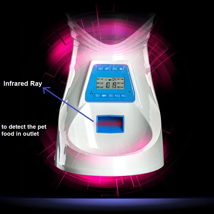 4. Предотвращение запирания пищи и разливов: Встроенный инфракрасный датчик может предотвратить блокировку пищи, Позвольте вашим питомцам насладиться едой. Эта система может вместить различные формы сухой и полу-влажных продуктов, но еда размер, не может превышать 0,39 "* 0,39"(1 см * 1 см) В противном случае еда может быть застревает в отверстии.