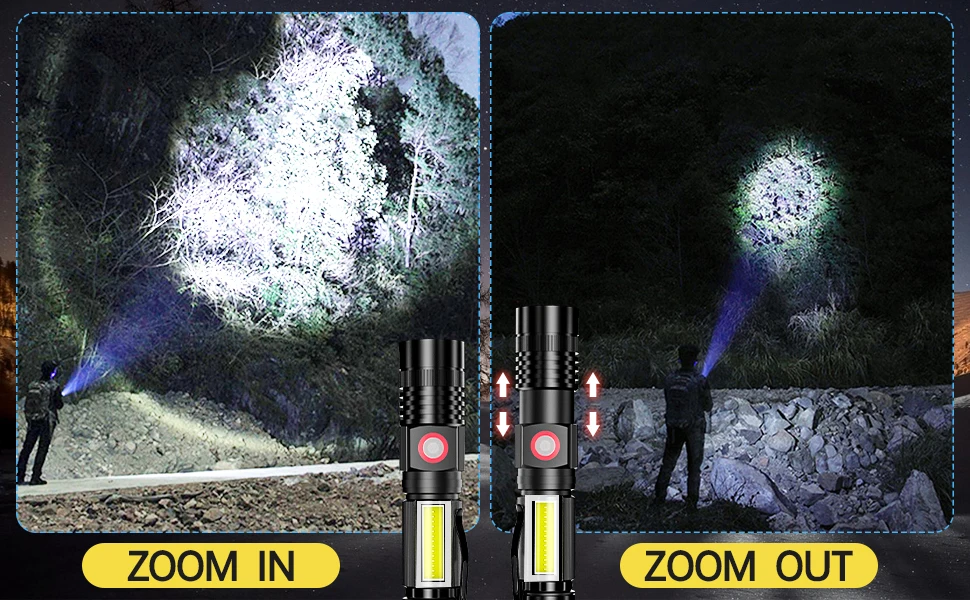 5. Водонепроницаемый и Регулируемый зум --- pocketman светодиодный фонарик IPX5 Водонепроницаемый, он безопасен при использовании в дождливую погоду. И Adjstable Zoom, которые позволяют вам фокусироваться, растягивая тело фонарика, в зависимости от ситуаций.