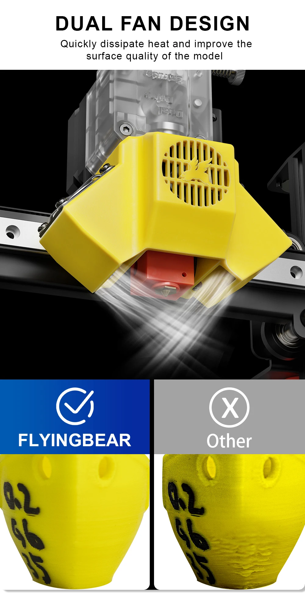 1.Двойная конструкция вентилятора:Быстро рассеивает тепло и улучшает качество поверхности модели