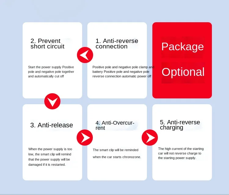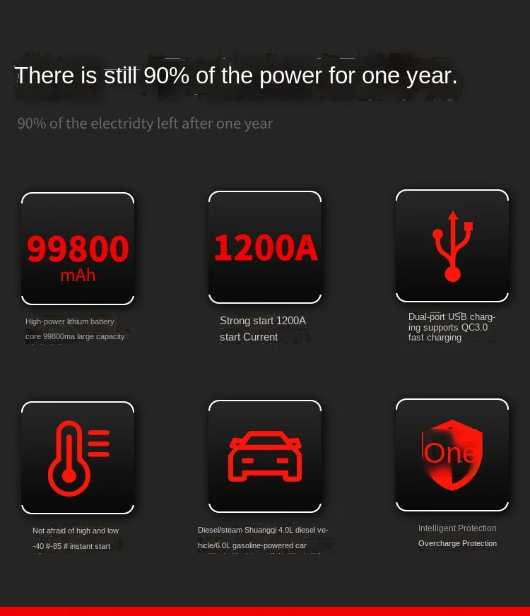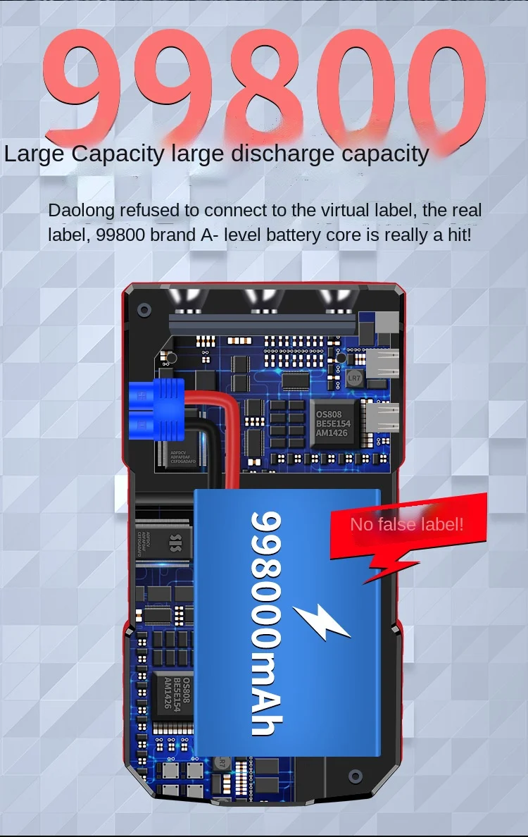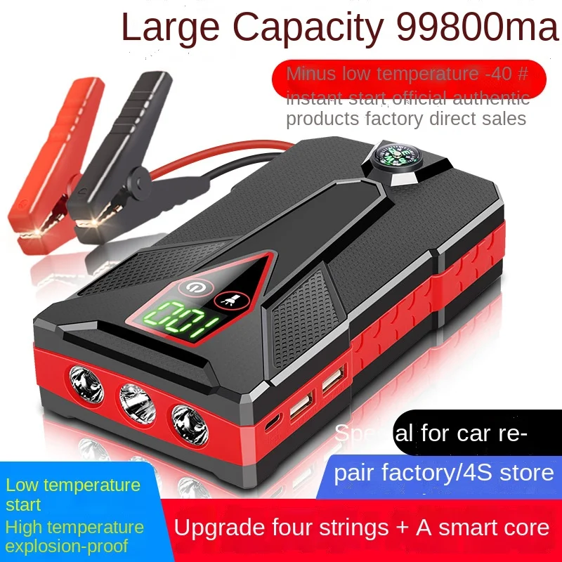 Product reference parameters:model: JX55Cell type: polymer lithium ion cellApplicable type: general typeBattery type: square aluminum shellAdditional function: LCDShell material: plasticConversion rate: 90 (%)Size: 160 * 80 * 30MMProduct function: start / inflation / charging / LightingOutput voltage: 12VProduct size: 160 * 80 * 30MMUSB input: 5V / 2.1aBattery capacity: 99800 MaCharging input: 15V / 1a, 5V / 2VStarting current: 600APeak current: 1200AColor: 99800mah simple set, 99800mah smart clip set, 99800mah pump set, 99800mah smart clip + pump setProduct certification: CeScope of application: car start, emergency lighting, digital chargingPower supply time: 1000 (m)9 quality upgrades:Automobile starting: 600A strong starting current9 protection: over discharge and over charge protectionHigh rate lithium battery: 99800mah high currentEmergency lighting: LED / SOS lightingDigital charging: 2usb2usb charging: 2usb fast chargingDo anti reverse connection socket: avoid reverse connection designLow temperature start: - 40 ° C low temperature strong startSmart screen display: the power is clear at a glanceAll our products can be ordered and produced in our factory. Friends all over the world are welcome to order and wholesale. The price can be negotiated. The company's products are guaranteed in quality and quantity, every penny is worth every penny, and the product quality is absolutely guaranteed! Please rest assured to buy. You will never regret your current order.