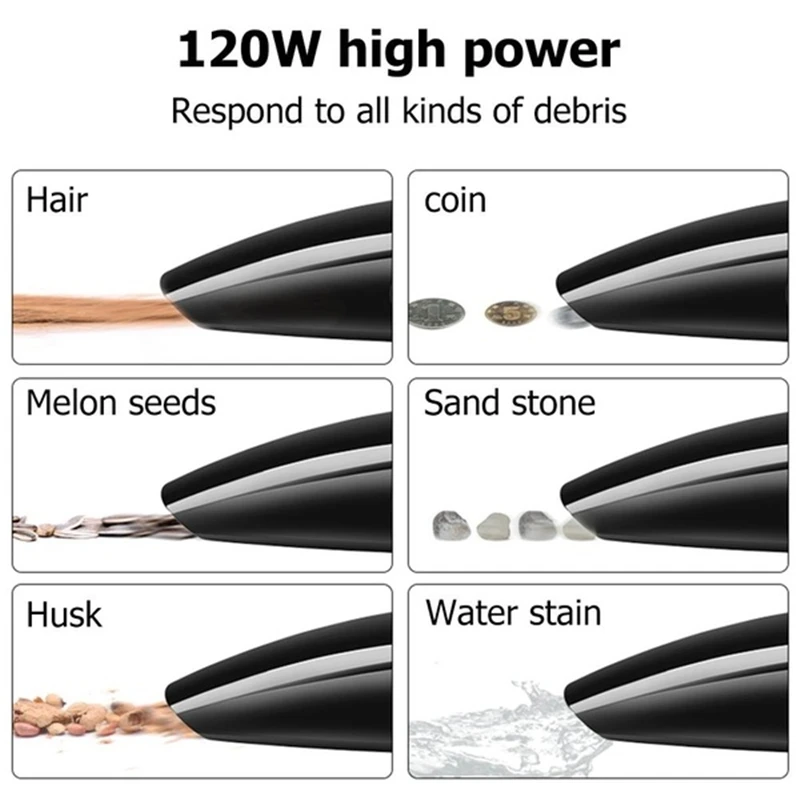 -Мощность 120 Вт, сильное всасывание, очистка за считанные секунды, может поглощать все виды мусора, монет, пепел для сигарет, водяных пятен и т. д. в автомобиле;