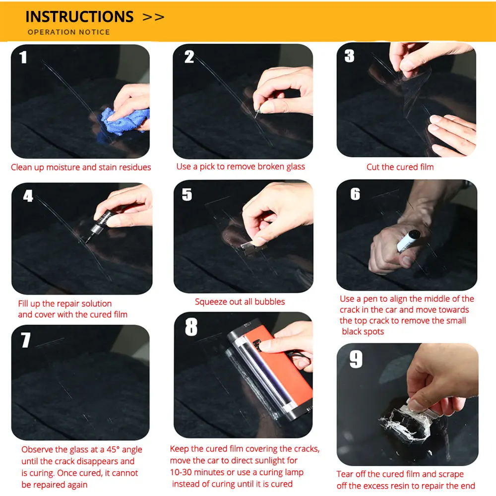 2. Повреждения должны быть устранены как можно скорее, чтобы предотвратить распространение мелких трещин. 3. Идеальная температура применения составляет 60 ℉ до 90 ℃ (15 ℃ до 32 ℃). Клей будет высушен под УФ-светильник, если у вас нет УФ-светильник, пожалуйста, сделайте ремонт под солнцем.