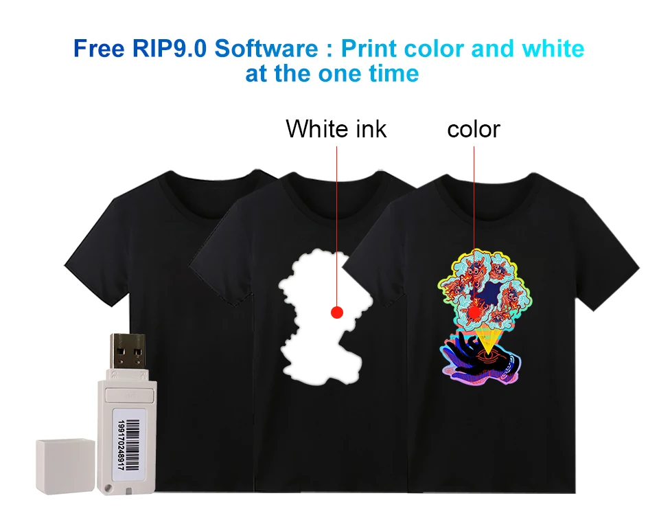 Преимущества принтера:1. Может напечатать на темноте и светильник, может получить яркие цвета и высокую яркость печати2. Простота в эксплуатации, с USB viideo руководство3. С регулятором температуры: помогает сушке чернил, делает печать лучше4. С бесплатным программным обеспечением Rip 9,0, может печатать белый и цвет одновременноИспользование:Печать на темном цвете и whit футболка, одежда, текстильная ткань и т. Д.