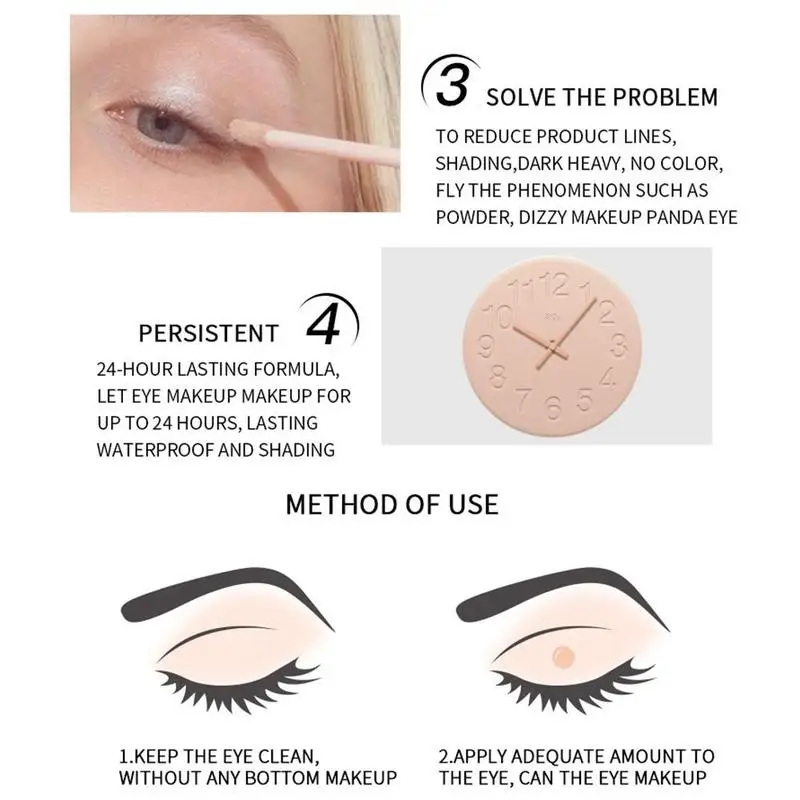 Инструкции по использованию: Нанесите 2-3 точки базового макияжа и консилера, аккуратно Смешайте их и нанесите на безымянный палец, глаза будут выглядеть более гладкими, а эффект консилера продержится дольше