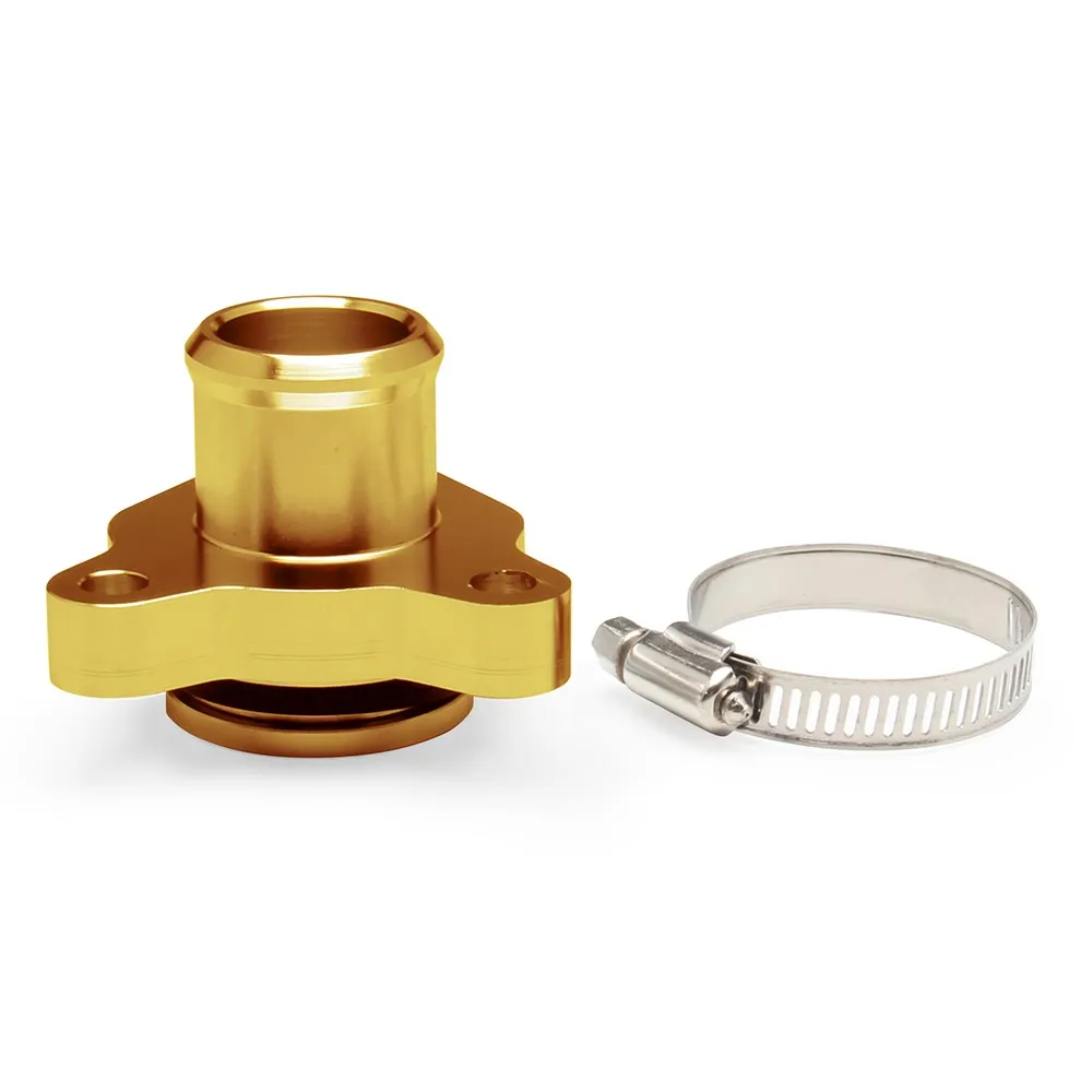 Просто снимите конец шланга с пластикового фитинга, а затем фитинг с головки (шланг не должен быть удален из корпуса термостата для этого). Затем установите сменный алюминиевый фитинг на головку и проведите шланг и хомут шланга над фитингом.