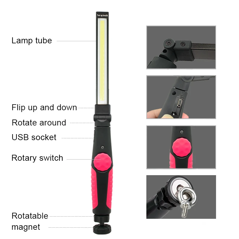 За исключением каретка 360 ° Вращение функция, COB рабочий светильник также включает в себя светильник Бар 140 ° вращение, которая обеспечивает более углы освещения. Кроме того, противоскользящий дизайн делает тонкий фонарик более удобным.
