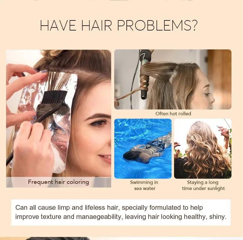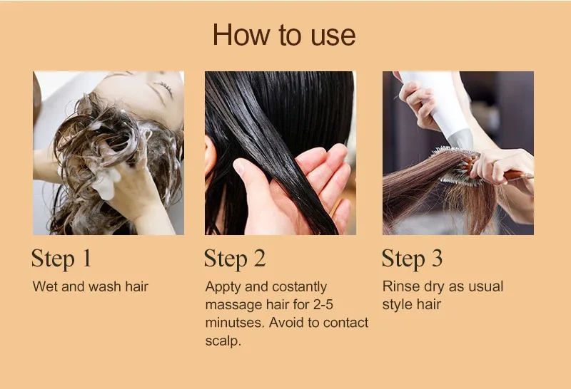 Нанесите маску для волос на волосы, не прикасайтесь к коже головы, постоянно массируйте волосы в течение 2-5 минут