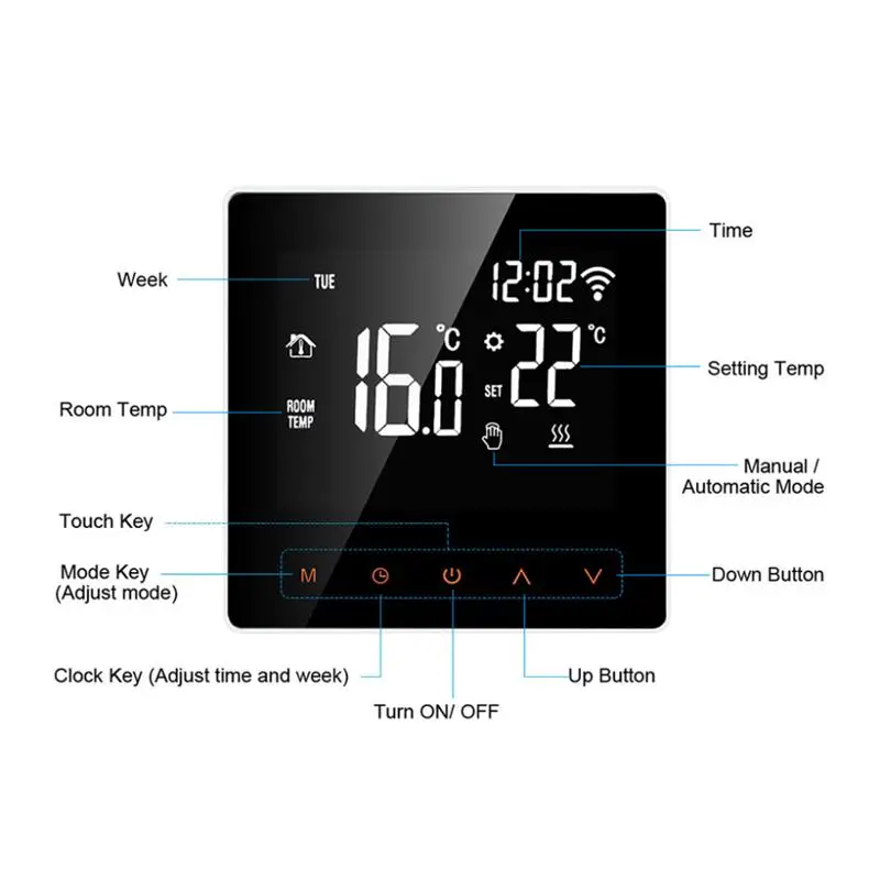 Описание:Пульт дистанционного управления: Этот термостат разработан в беспроводном стиле, вы можете управлять им через голосовое и телефонное приложение, освобождая руки и делая вашу жизнь более удобной.