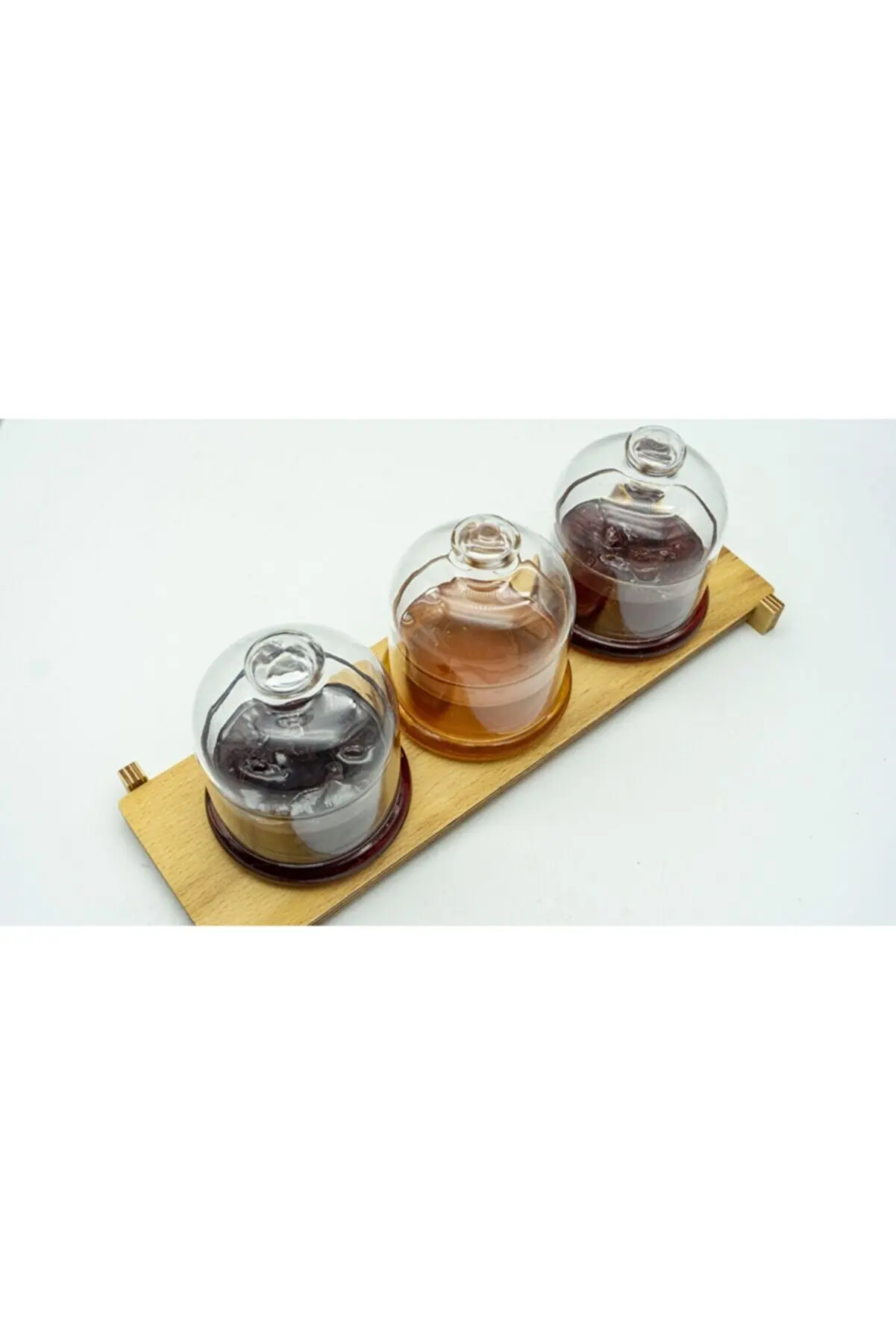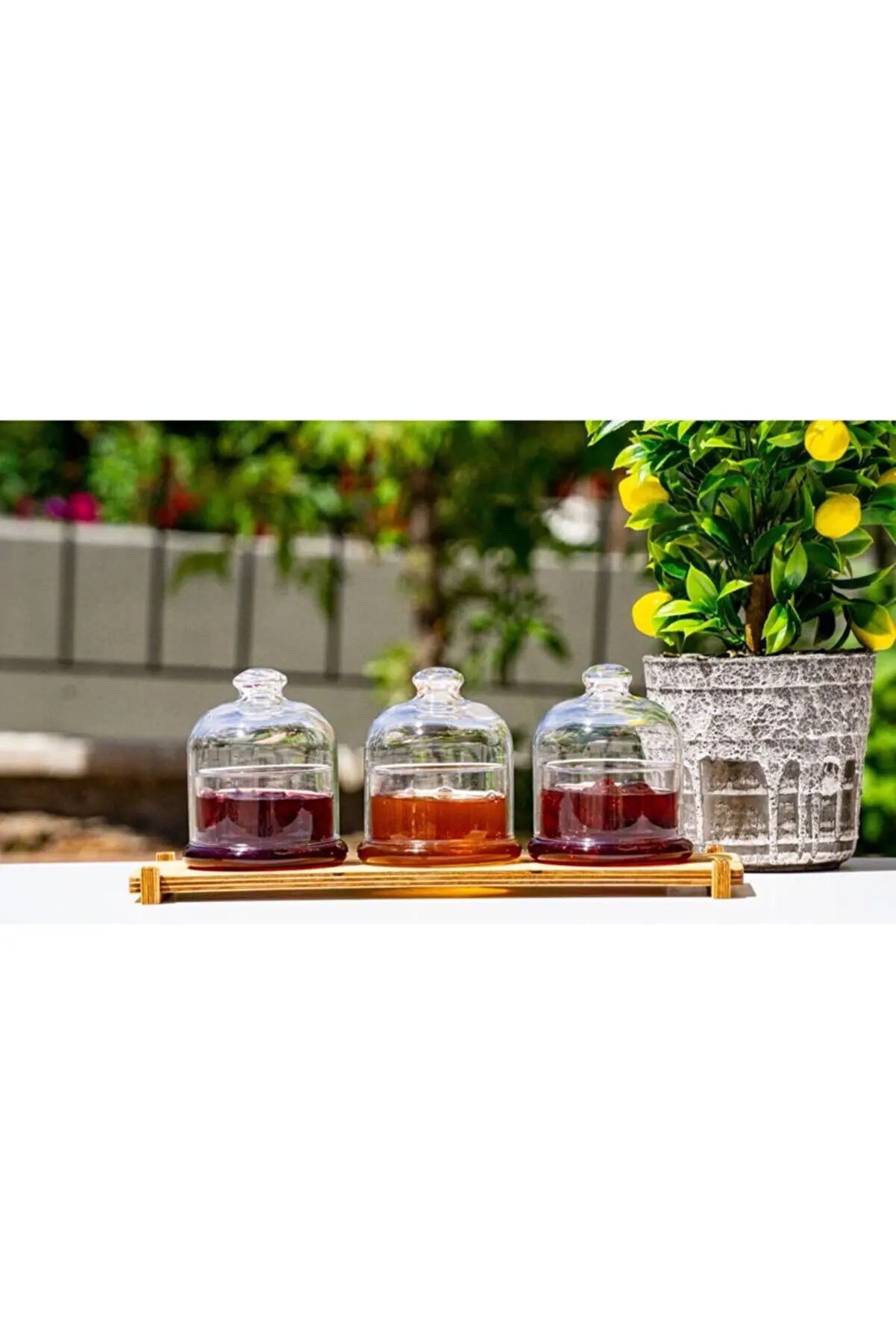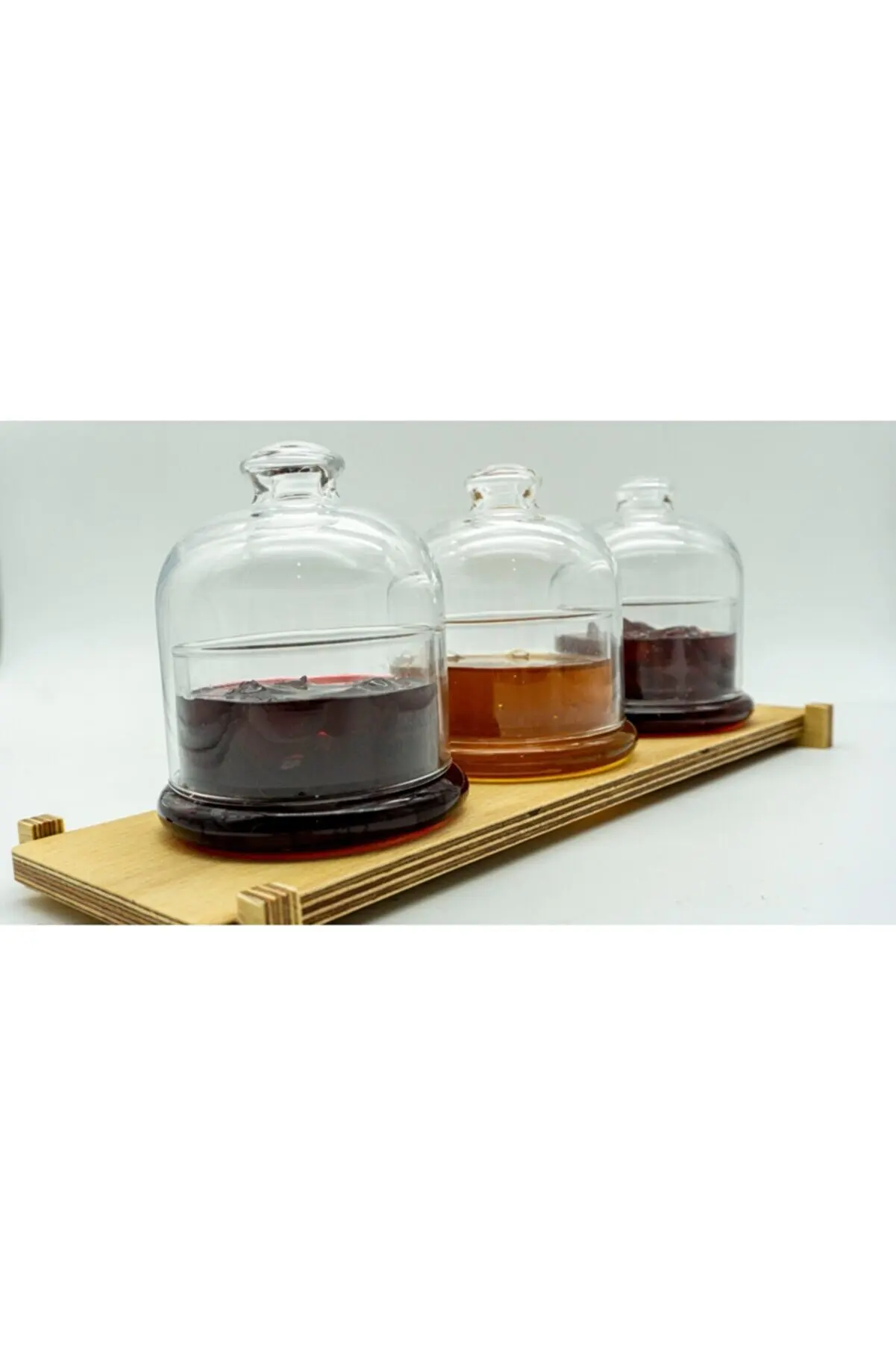 Изделие состоит из 3 держателей для варенья с крышками и 1 деревянного основания.
