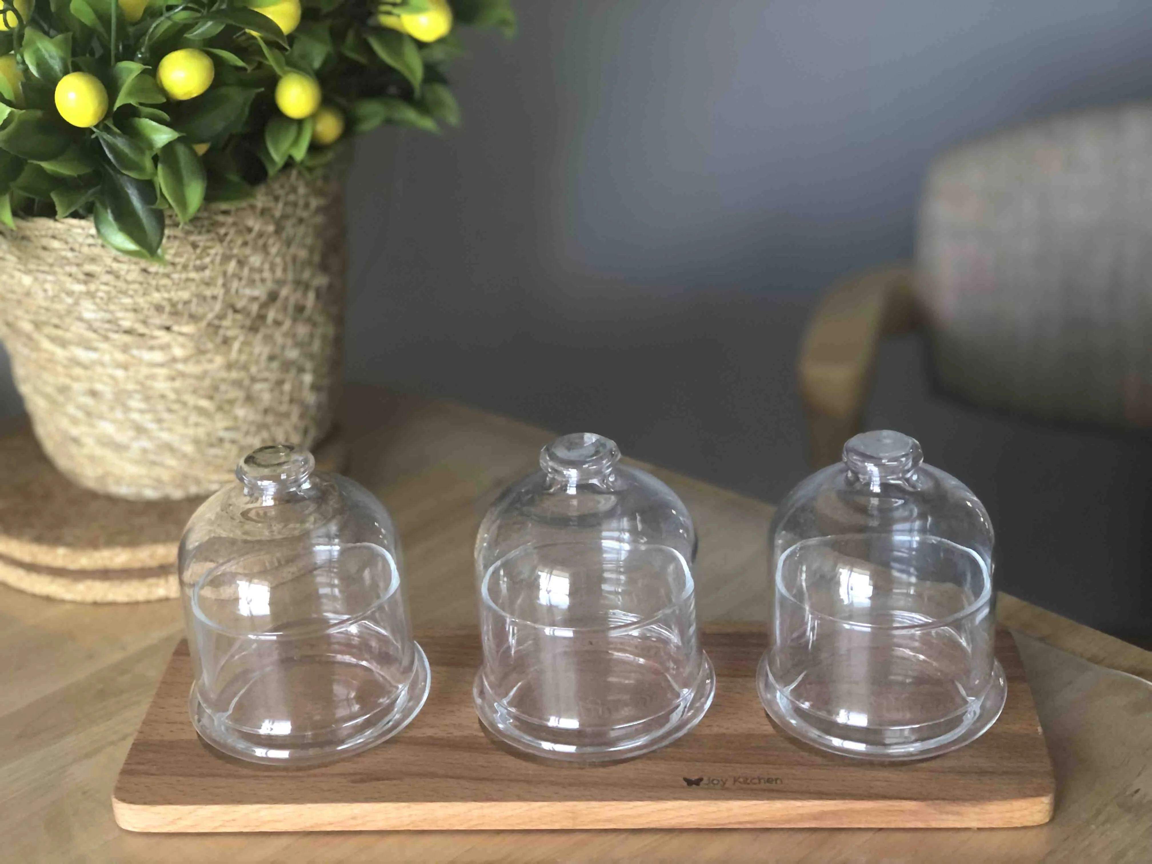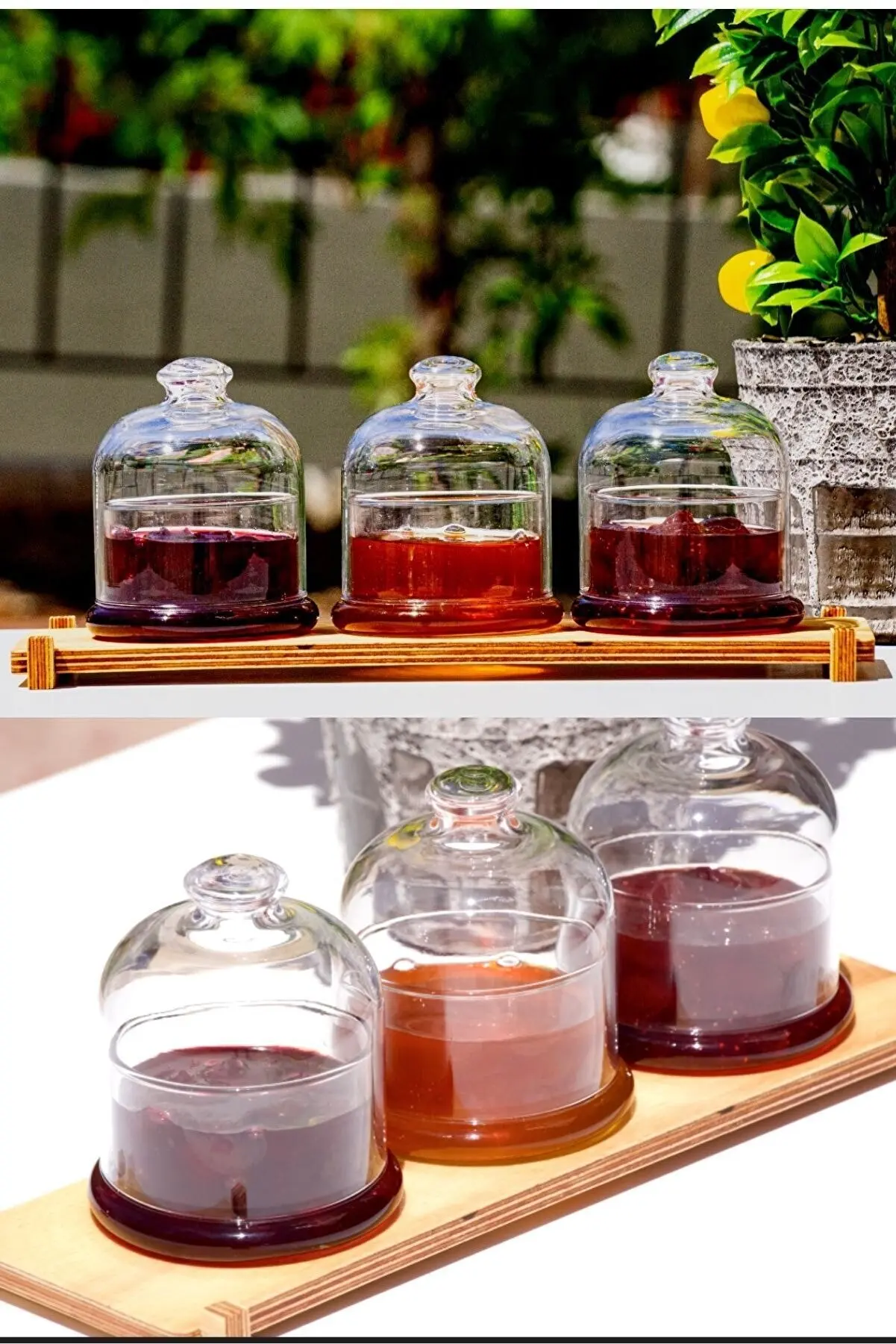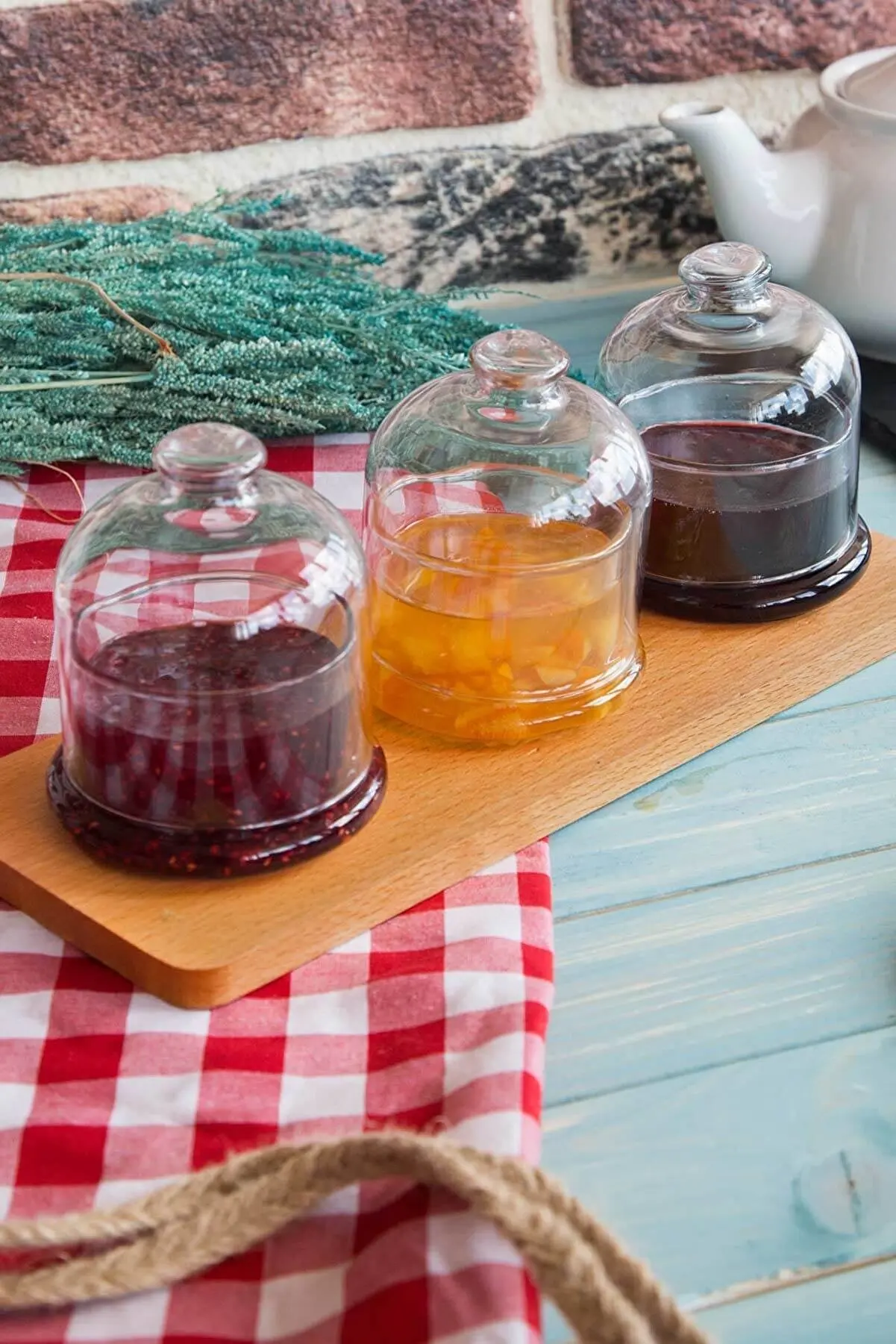 Изделие состоит из 3 держателей для варенья с крышками и 1 деревянного основания.