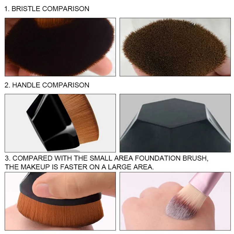 ** Плотная и мягкая щетина: она очень мягкая на ощупь и нанесение основы на лицо, приятная для кожи, не впитывает и не теряет продукты и гладко и равномерно наносит тональный крем.