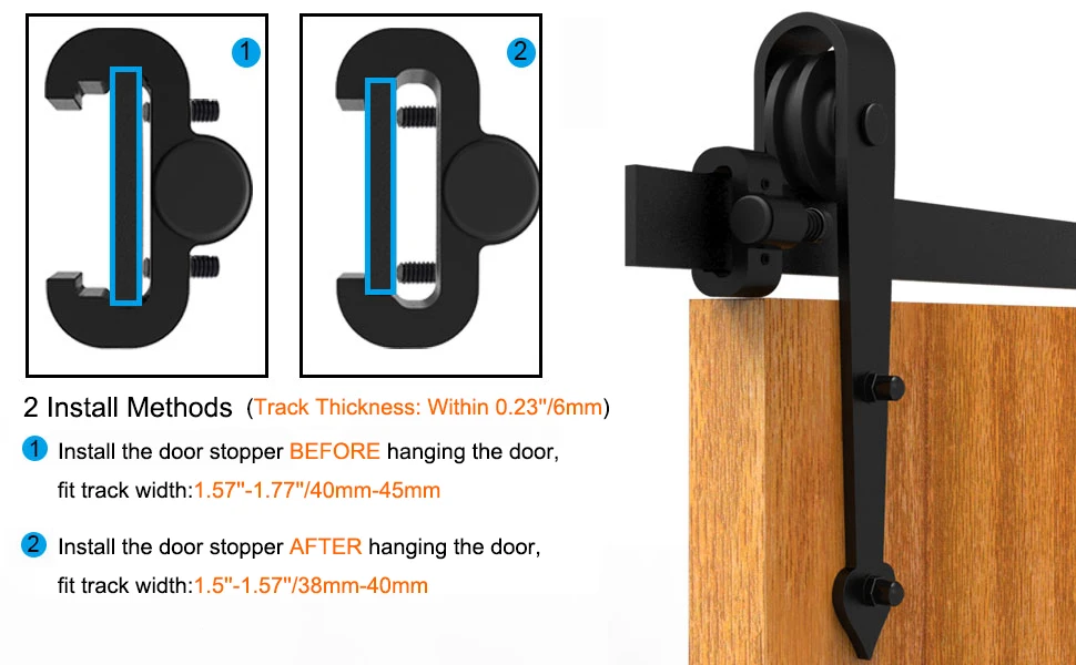 Модернизированная металлическая пробка для двери сарая, установленная на обоих концах рельса, чтобы предотвратить скольжение колес из рельса. Подходит для: 40 мм-45 мм/1,57 ''-1,77'' ширина и 3 мм-5,5 мм толщина.