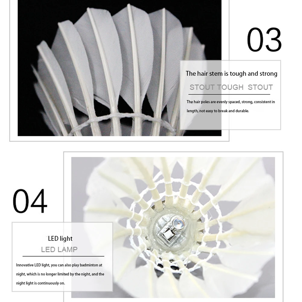 Feature: The light touch switch flashes quickly and can be kept for more than 20 hours. When the battery is dead, it can be used as an ordinary badminton. Good durability and excellent performance. The wonderful experience of playing badminton in the evening. Specification: Name: Colorful Badminton Size: 87x63mm/3.43*2.48in Material: Duck Feather Ball Weight: 15g/pc Color: Color, Red, Green, Blue Note: Due to the different monitor and light effect, the actual color of the item might be slightly different from the color showed on the pictures. Thank you! Please allow 1-2cm measuring deviation due to manual measurement. ![]() 10 X Badminton