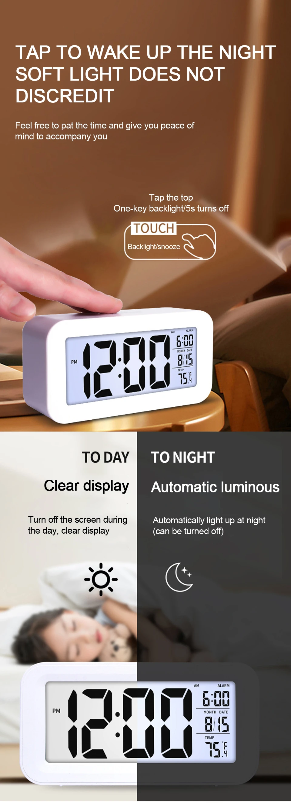 2) Функция «умный светильник»: технология «умный светильник» использует мягкий светильник, чтобы видеть время ночью, но он не будет блистать и не повлияет на сон. Что еще более важно, это экономит электричество, и умный светильник можно свободно Переключить.