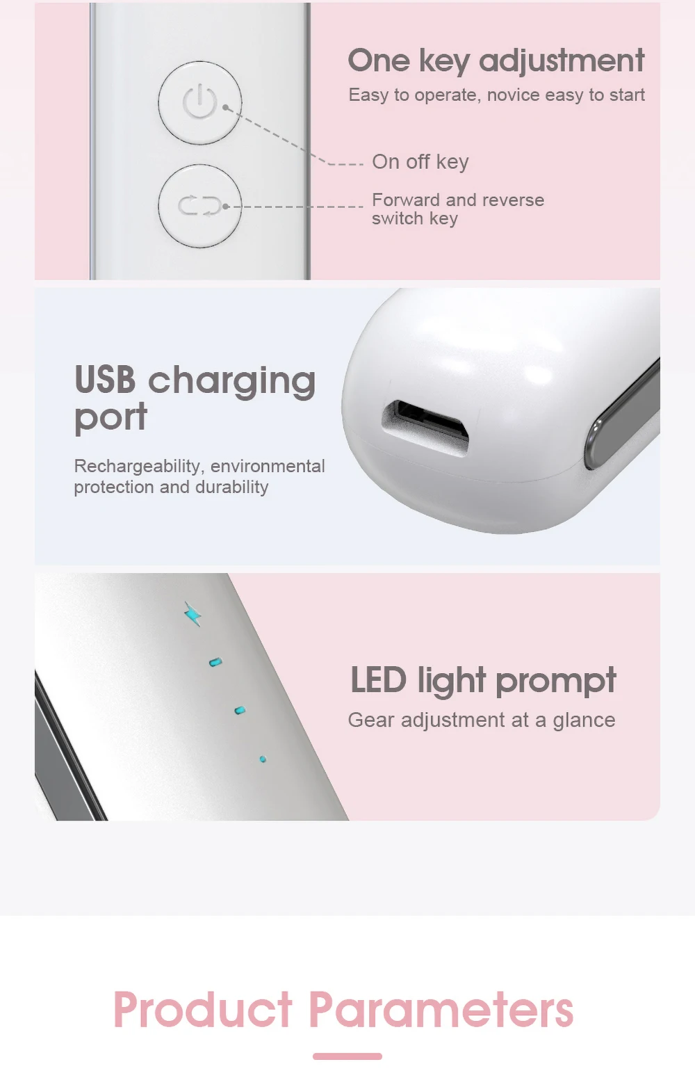 Technical features: 3-speed speed regulation, positive and negative switching, convenient charging, spotlight lighting