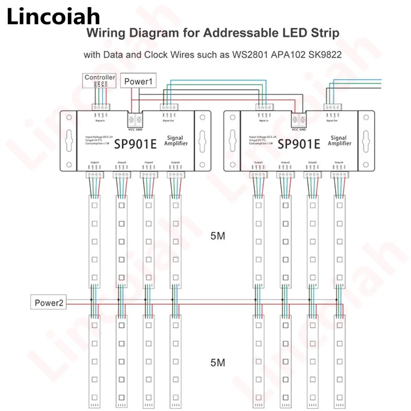 Усилитель сигнала Lincoiah SPI совместим со всеми видами сигнала 5V-TTL. Он получает один сигнал и одновременно выводит 4 или 8 каналов сигналов. Каждый канал может управлять таким же количеством светодиодный пикселей, как и основной контроллер.