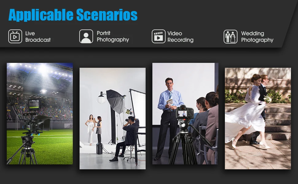Этот профессиональный штатив для камеры подходит для нескольких сценариев, таких как ПОРТРЕТНАЯ ФОТОГРАФИЯ, видеозапись, свадебная фотография, прямая трансляция и т. д. Этот видео штатив может удовлетворить ваши различные потребности съемки.