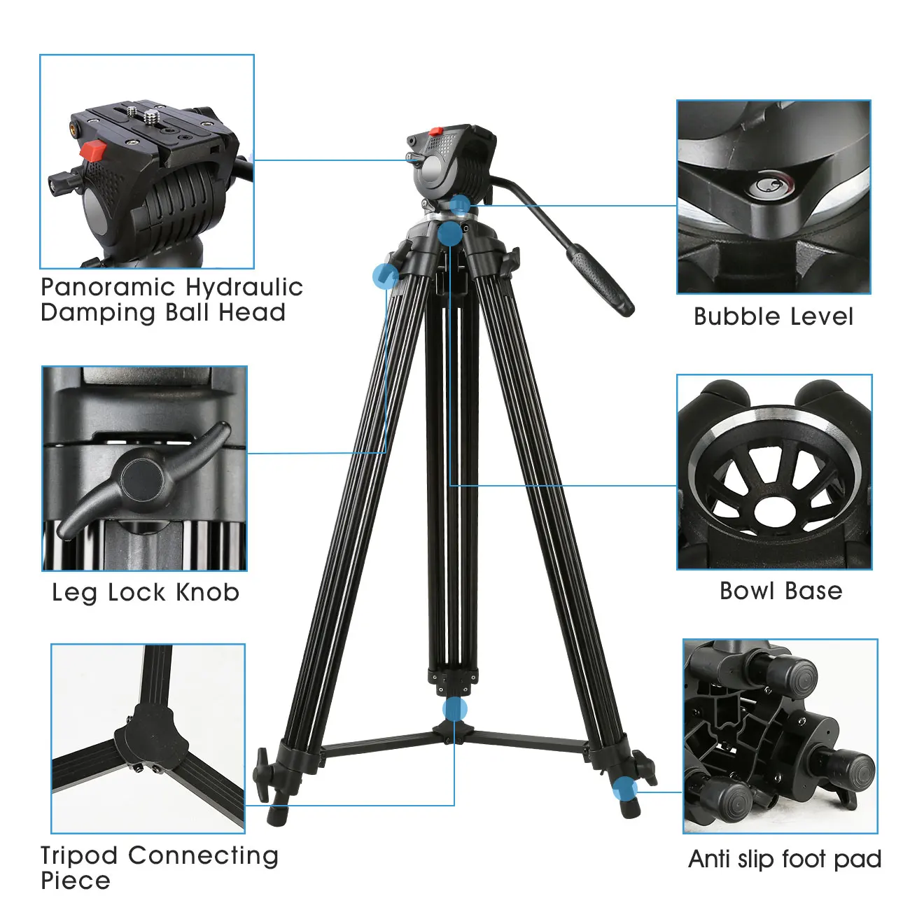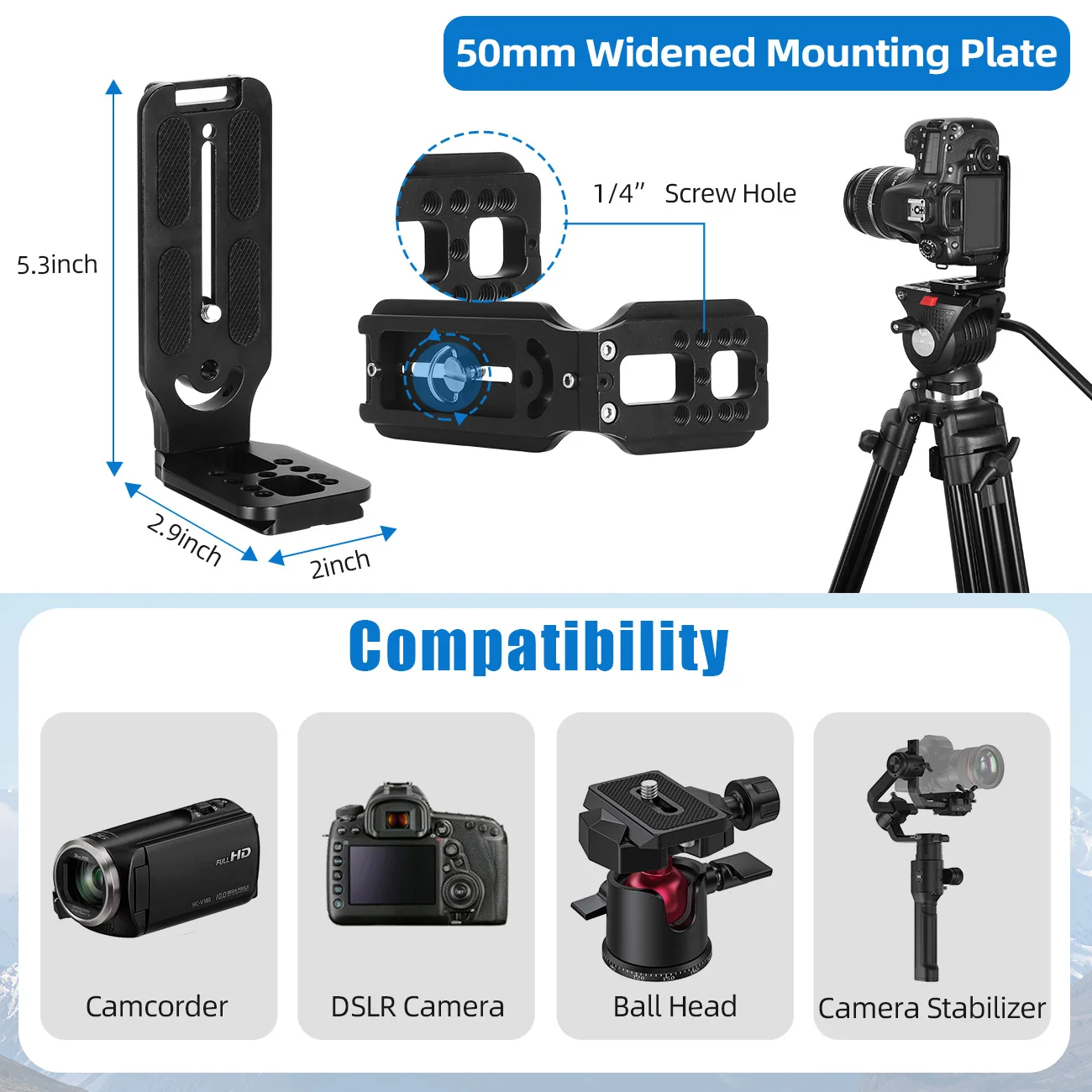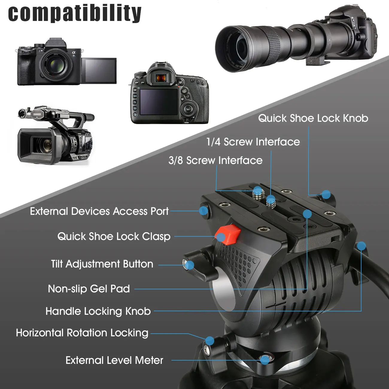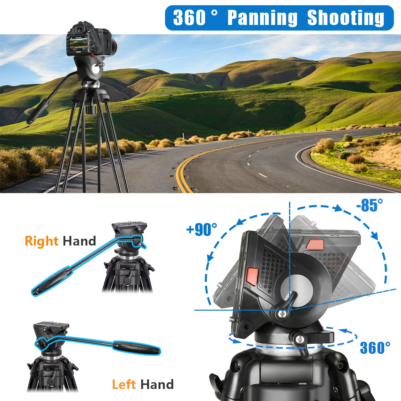 Головка жидкости имеет заданный противовесный баланс, с фиксированным сопротивлением жидкости как в ПАНОРАМЕ, так и в осях наклона. Поддержка панорамной съемки 360 ° и + 90 °/ -85 ° наклона фотографирования. И БЫСТРОРАЗЪЕМНАЯ пластина оснащена винтом 1/4 и 3/8, совместима с большинством устройств для фотосъемки и видеосъемки. Подходит для камер Canon Nikon Sony Fujifilm Ricoh Panasonic Leica.