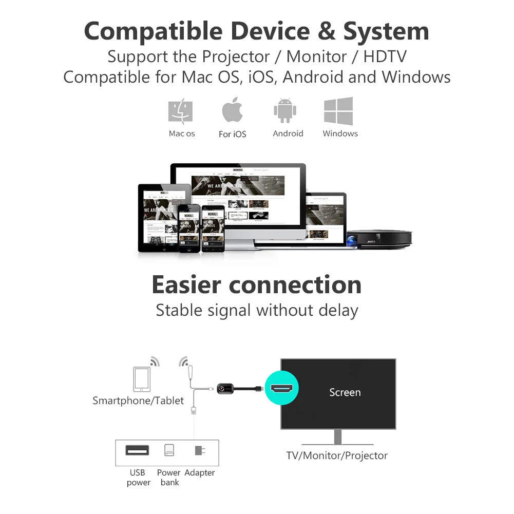 Простота в использовании и установке. Подключи и играй, не нужно загружать какой-либо Драйвер программного обеспечения или приложение для этого ТВ-адаптера, 3 шага, чтобы насладиться на большом экране. Подключите его к HDMI-совместимому интерфейсу телевизора, затем используйте блок питания 5 В/2 А, наконец, выберите режим Miracastor DLNA с инструкциями.!