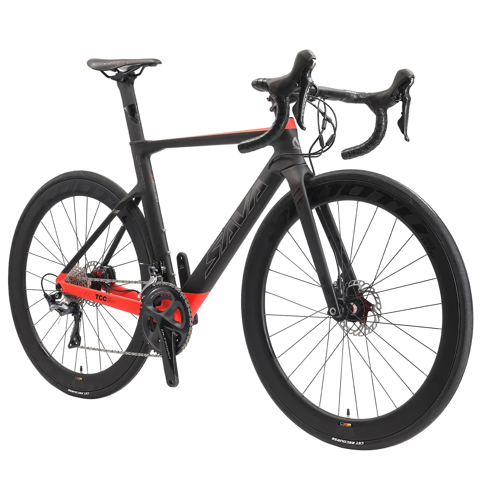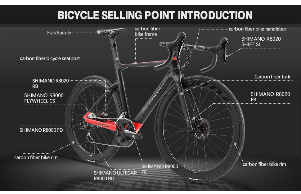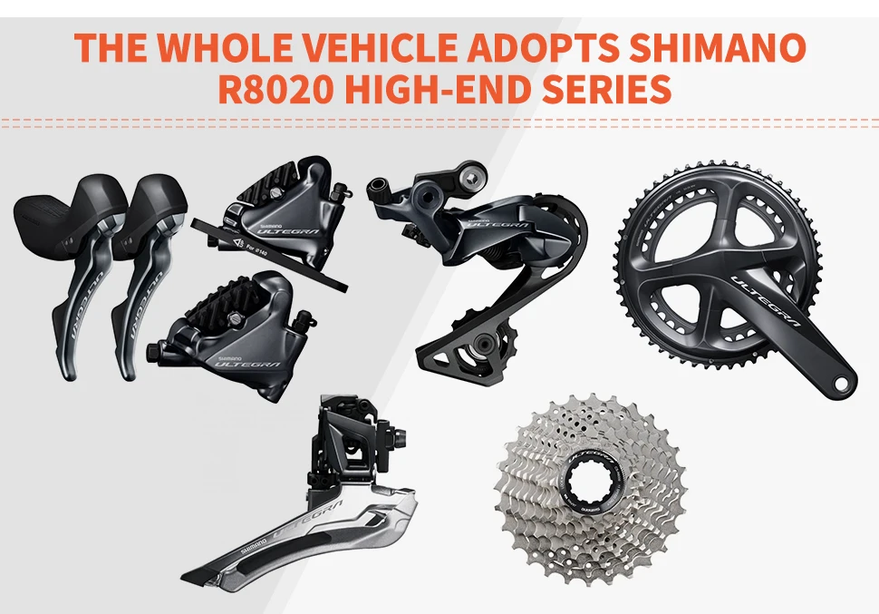 Внутренняя конструкция кабеля приливная и красивая. Коаксиальный дизайн более стабильный во время езды. SHIMANO ULTEGRA groupset - SHIMANO ULTEGRA-R8020 2*11 скорость с переключением, передний переключатель, задний переключатель, коленчатый набор и колесо свободного хода-это легкий и жесткий дорожный велосипед из углеродного волокна.