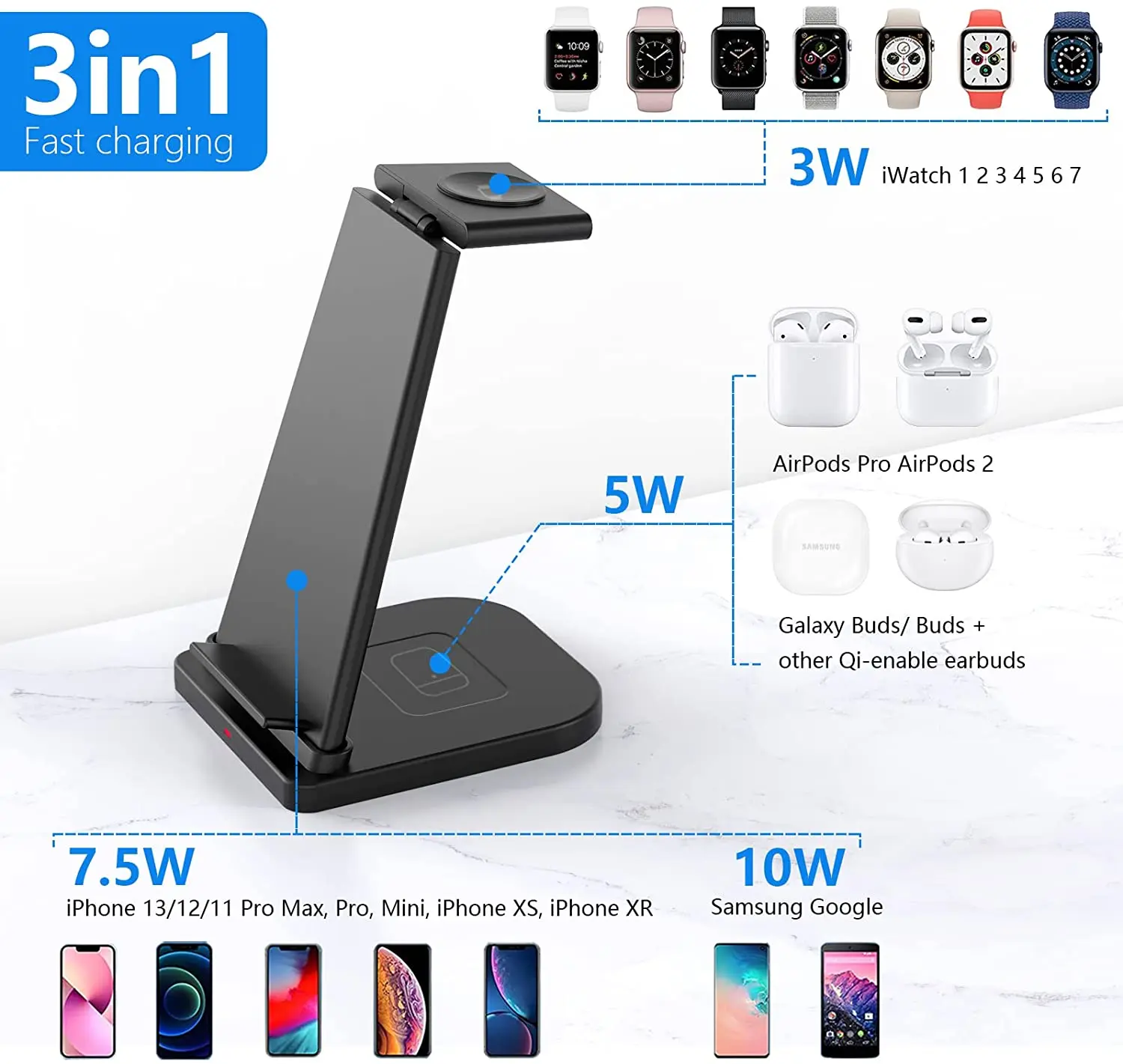 【Быстрая Беспроводная зарядка:Для быстрой зарядки требуется адаптер QA3.0 (не входит в комплект). 7,5 Вт Режим зарядки для литий-ионных аккумуляторов iPhone 13/13 Pro/13 Pro Max/13/12/12 Pro/12 Pro Max/12/SE 2020/11/11 Pro/11 Pro Max/XS MAX/XS/XR/X/8 plus; 15 Вт режим быстрой зарядки подходит для Samsung Galaxy S21/S20/S20 +/S20 Ultra/Note 10/10 Plus/S10 Plus/S10E/Note9/S9/Note 8, S8, S8 Plus, s7, S7 Edge. Режим зарядки 5 Вт для AirPods Pro/Airpods 2 и 2 Вт Режим зарядки для iWatch 7/6/SE/5/4/3/2.