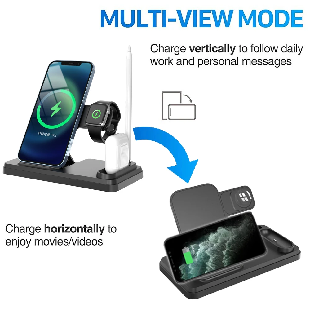 Благодаря складному и гладкому дизайну, универсальная беспроводная зарядная площадка с регулируемым кронштейном 0 °-75 ° для удобного вертикального или горизонтального угла обзора, позволяет легко смотреть фильмы или начинать видеоконференции во время зарядки. Беспроводное зарядное устройство не только является зарядным устройством, но и «домом» для каждого вашего устройства.
