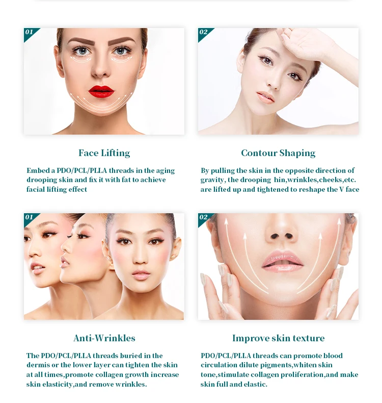Резьба Pdo Являются иглами подкрепленными синтетическим ПДО рассасывающимся швом. PDO (полидиоксанон) швы-это хирургические швы, которые используются для проведения сердечной хирургии. Все швы сертифицированы CE и pdo являются одним из самых безопасных материалов, которые могут быть использованы в организме. Ваша кожа полностью впитывает нить A & D в течение 4-6 месяцев, не оставляя рубцов.Эта обработка отличается высокой безопасностью, регулируемостью, кратковременной реакцией.Придайте рассасывающийся шов под кожу, чтобы поднять его,Как только нить впитывается, коллаген начинает расти, и она прослужит больше 2 лет. Стимулирует регенерацию коллагена и способствует циркуляции крови, чтобы поднимать и подтягивать кожу, и достичь двойного эффекта естественного удаления морщин лица.