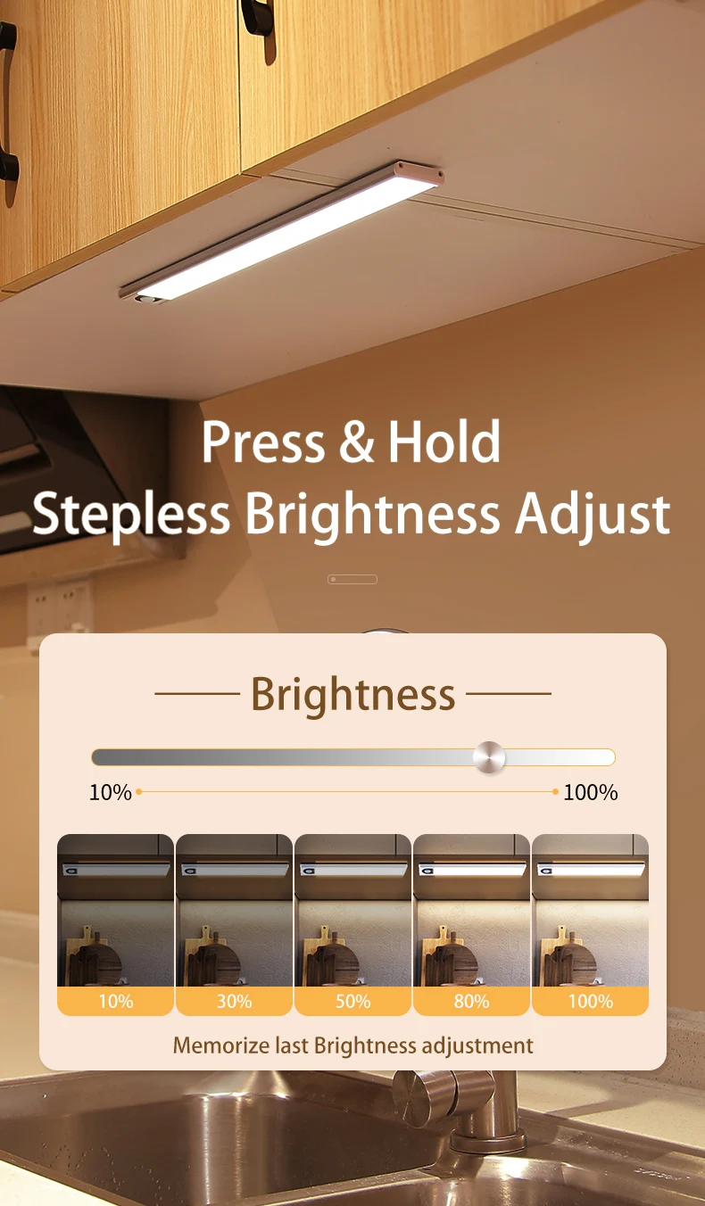 Забудьте об уровне яркости, просто удерживайте кнопку, чтобы войти в бесступенчатый режим регулировки яркости. Этот светильник всегда запоминает последние настройки яркости, что делает его светильник, который знает вас лучше всего.