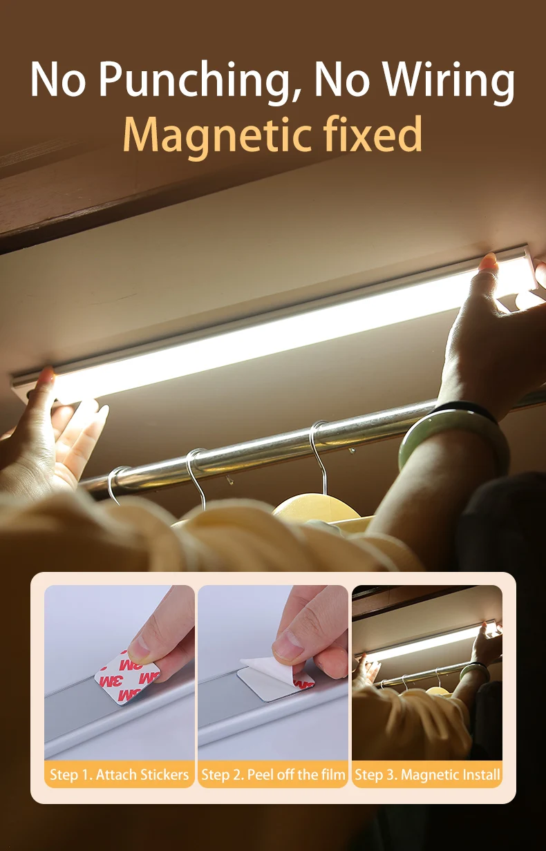 Встроенные магниты, поставляются с магнитными наклейками, так что вы можете установить в любом уголке, который вам нужен светильник. Прикрепите наклейки на светильник магнитно, затем снимите пленку, теперь вы можете прикрепить к любой поверхности. И его также можно легко снять.