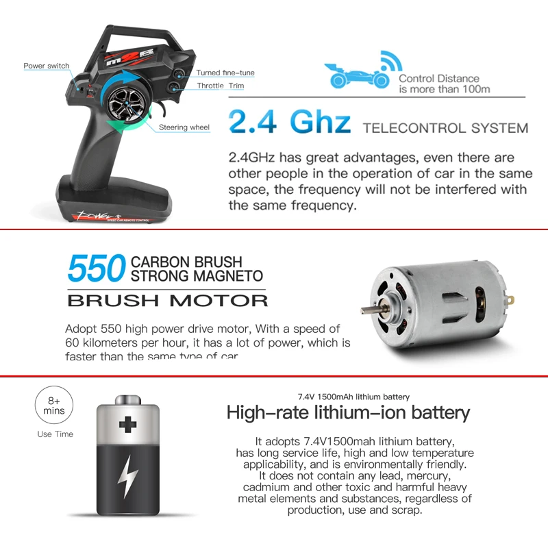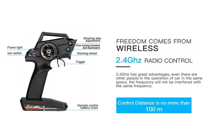 2,4 ГГц радио Системы с способность анти-помех позволяет гонки в одно и то же время в одном и том же пути. 100 метров дистанции управления, Гонки свободно.