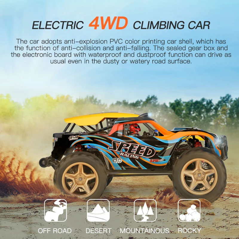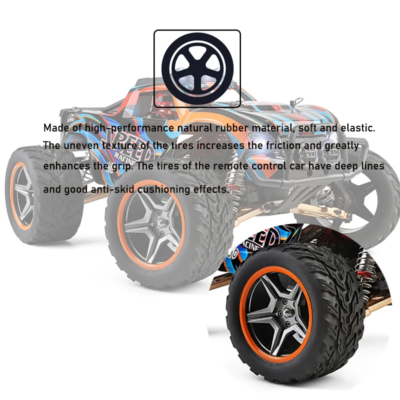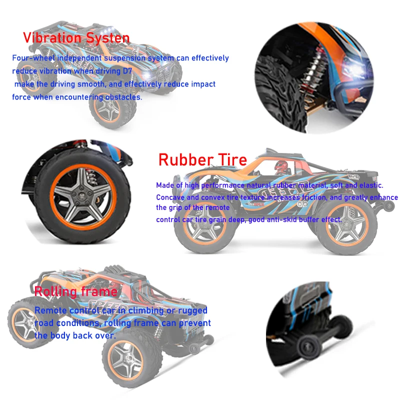 Взрывозащищенные ПВХ цветные печатные автомобильные оболочки, вездеходные резиновые шины с сильной адгезией и сопротивлением трению. Независимая подвеска передних и задних колес для плавного поворота и стабильной осанки тела. Герметичная коробка передач и электронная доска с водонепроницаемой и пыленепроницаемой функцией могут управлять как обычно даже в пыльной или водной дороге. 2.4g высокоточная система дистанционного управления.