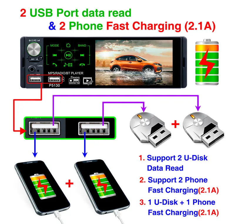 2USB дизайн 2.1A мобильный телефон функция быстрой зарядки, зарядка и воспроизведение музыки являются правильными.