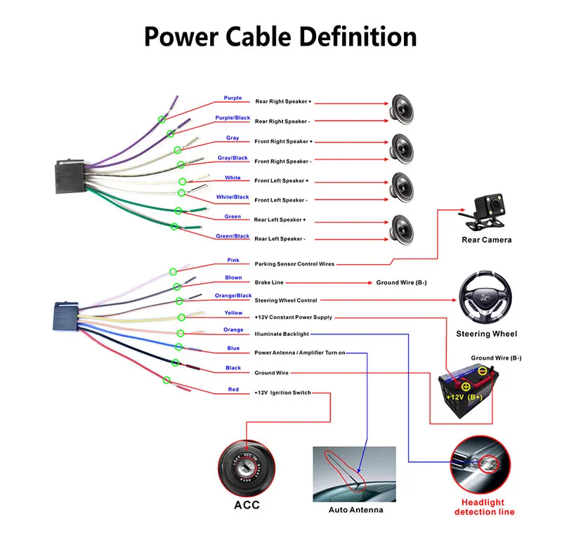 Примечание: Пожалуйста, не забудьте использовать наш шнур питания для подключения автомобильного радио, не подключайте оригинальную автомобильную вилку непосредственно к нашей машине.