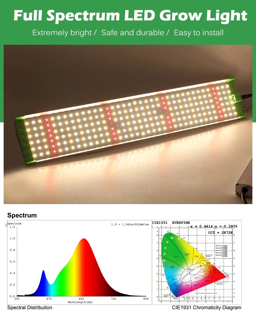Как и естественный солнечный свет-он излучает все длины волн от 380нм до 800нм. Растения могут получить спектр более эффективно, они больше всего желают от этого растительного светильник. Подходит для всех этапов роста, таких как сеялка, прорастание, растительное и цветение. Широко используется для выращивания палаток, гидропоники, теплицы, садоводства в помещении и так далее. Подходит практически для всех растений, таких как травы, суккуленты, овощи, деревья бонсай, комнатное растение, Орхидея, лимоны, Чили, помидоры, водоросли и т. Д.