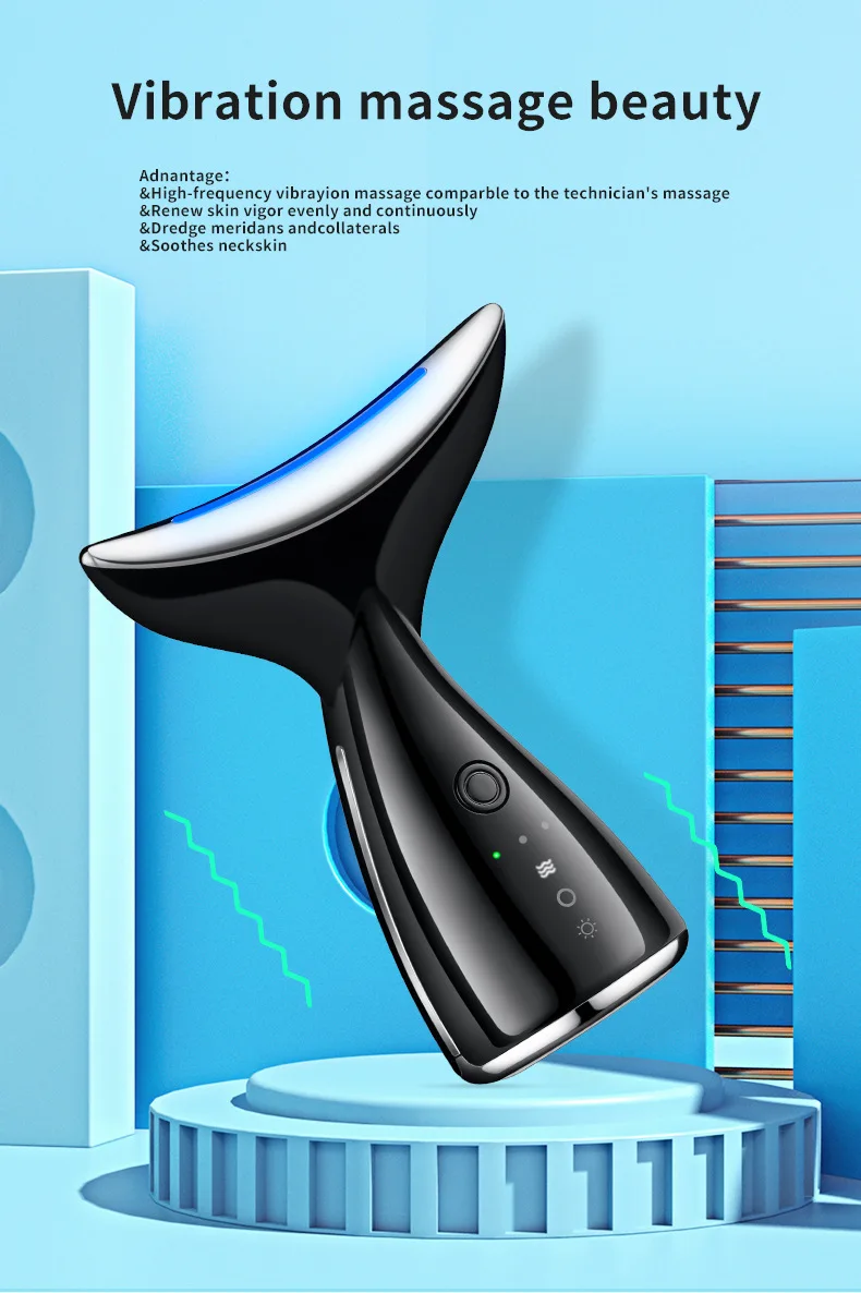 (2) массажная головка звуковая вибрация с тремя режимами, сопровождается синим, красным, фиолетовым светильник трех цветов, EMS массаж, совместно способствует циркуляции крови и способствует метаболизму, для достижения опреснения линий шеи, уменьшает отеки, расслабляет плечи и шею, акупунктурная терапия, быстро устраняет усталость и восстанавливает физическую силу.