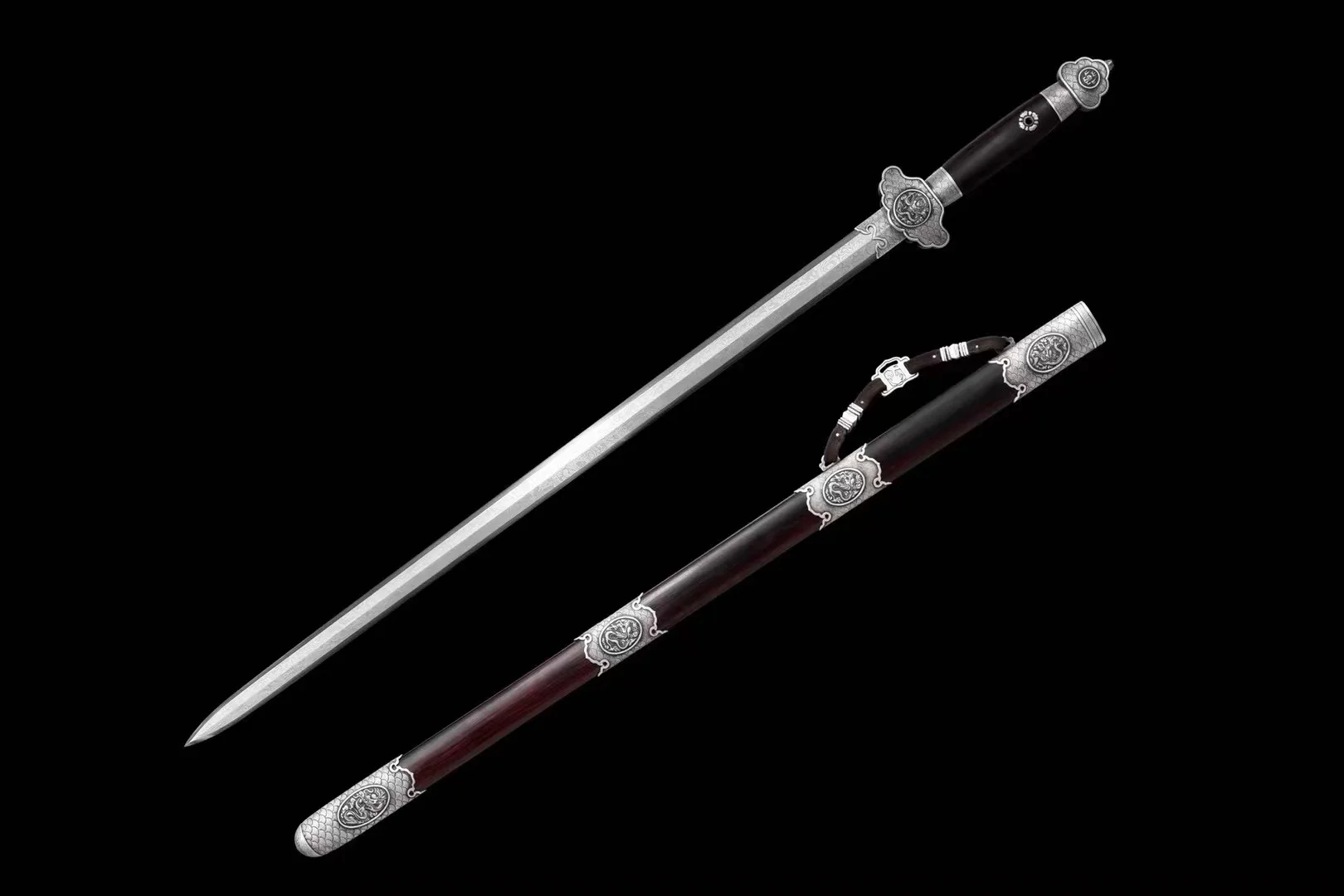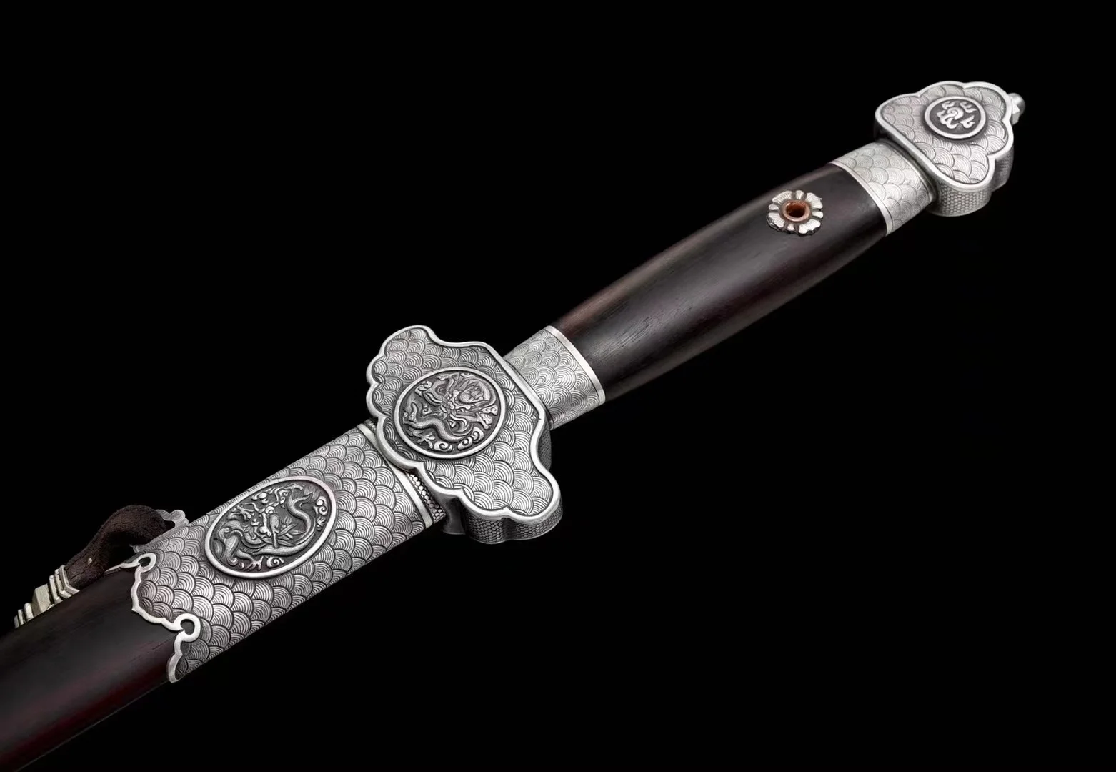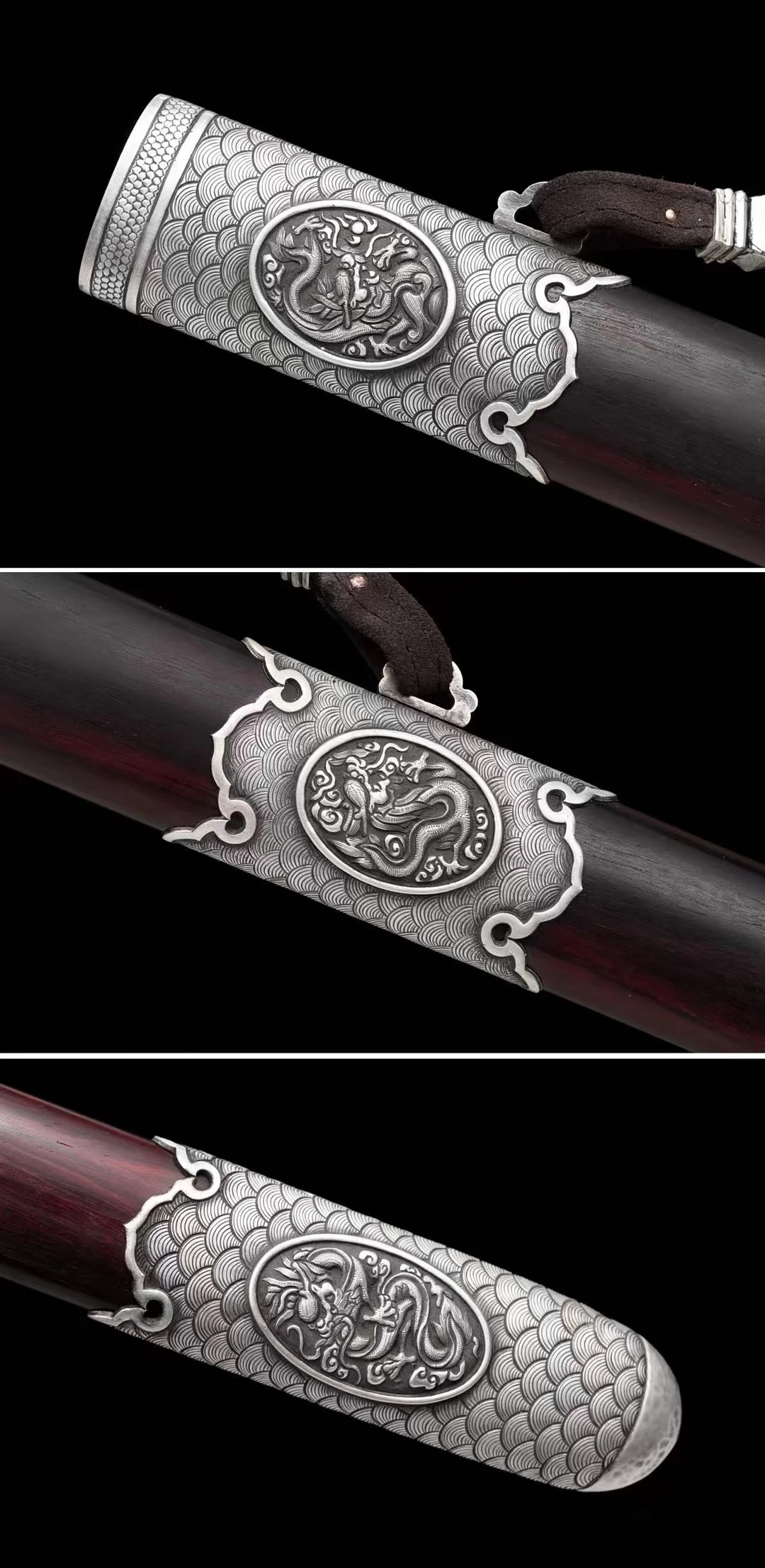 Тело меча изготовлено из железного метеорита (небесного железа) и железа для волос в качестве сырья, выковано древними методами, показывая шаблон ковки, как беговые облака и струящаяся вода, И затем через процесс зажима стали, и закаленный Qixing колодцем водой, чтобы сделать его иметь характеристики стали и мягкости. Чисто ручная работа первоклассное тонкое исследование; Костюм меча изготовлен из серебра 999 для чистой ручной резьбы, и используется мастерство плоского цветка и рельефа, что является изысканным; ножны изготовлены из тонкого красного сандалового дерева.