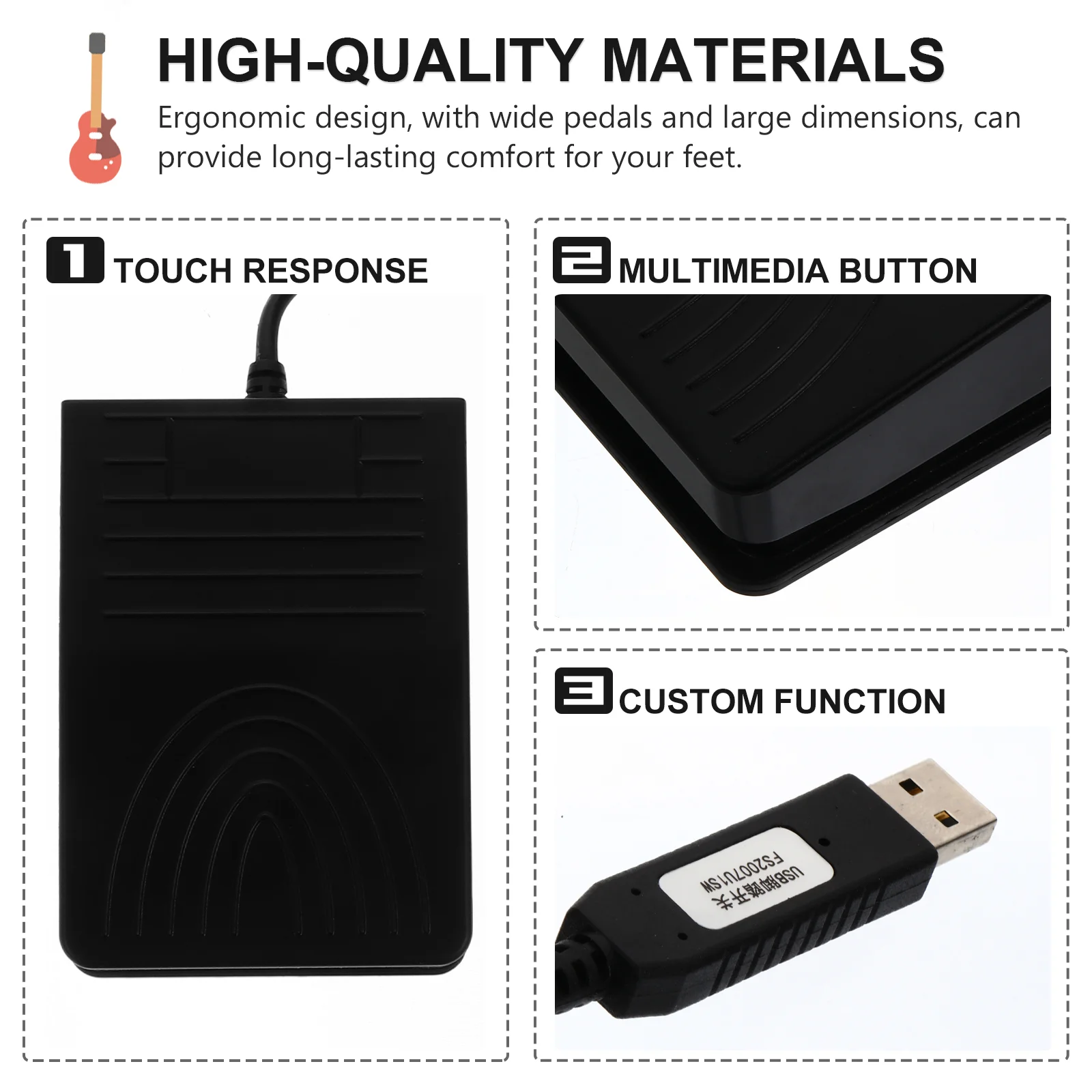 -Эта ножная педаль имеет прочные, чувствительные переключатели, которые являются минимальным сопротивлением иЛегкая сенсорная реакция.