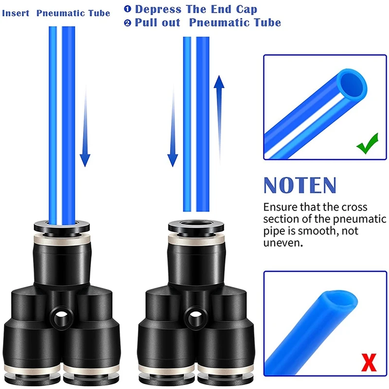 4 различных типа: Есть 4 различных типа фитингов для труб, включая тройник, локоть, Y и прямой, которые могут произвольно изменить направление после установки, И может быть вставлен вручную и вытащен из газовой трубы без дополнительных инструментов; Различные стили могут удовлетворить различные потребности пневматических трубопроводов.